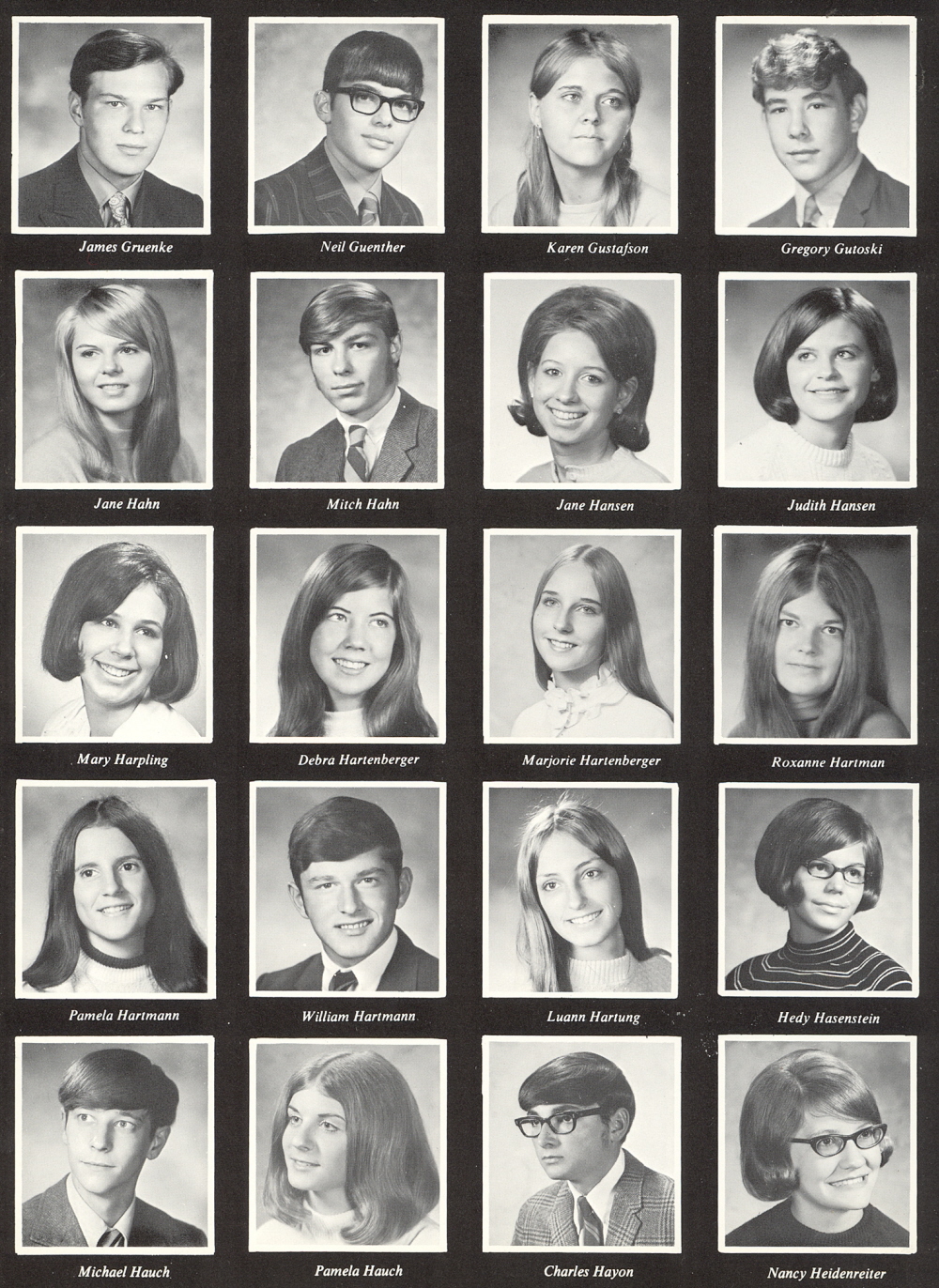 High School, Pages 124 & 142: James Gruenke, Neil Guenther, Karen Gustafson, Gregory Gutoski, Jane Hahn, Mitch Hahn, Jane Hansen, Judith Hansen, Mary Harpling, Debra Hartenberger, Marjorie Hartenberger, Roxanne Hartman, Pamela Hartmann, William Hartmann, Luann Hartung, Hedy Hasenstein, Michael Hauch, Pamela Hauch, Charles Hayon, Nancy Heidenreiter.