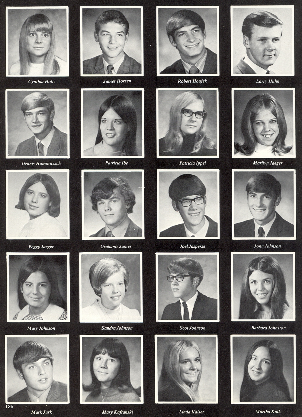 High School, Pages 126 & 143: Cynthia Holtz, James Horzen, Robert Houfek, Larry Huhn, Dennis Hummitzsch, Patricia Ibe, Patricia Ippel, Marilyn Jaeger, Peggy Jaeger, Grahame James, Joel Jasperse, John Johnson, Mary Johnson, Sandra Johnson, Scot Johnson, Barbara Johnston, Mark Jurk, Mary Kaftanski, Linda Kaiser, Martha Kalk.