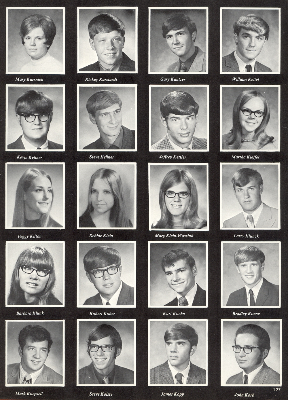 High School, Pages 127 & 143: Mary Karsnick, Rickey Karstaedt, Gary Kautzer, William Keitel, Keven Kellner, Steve Kellner, Jeffrey Kettler, Martha Kieffer, Peggy Kilton, Debbie Klein, Mary Klein-Wassink, Larry Klunck, Barbara Klunck, Robert Kober, Kurt Koehn, Bradley Koene, Mark Koepsell, Steve Kolste, James Kopp, John Korb.