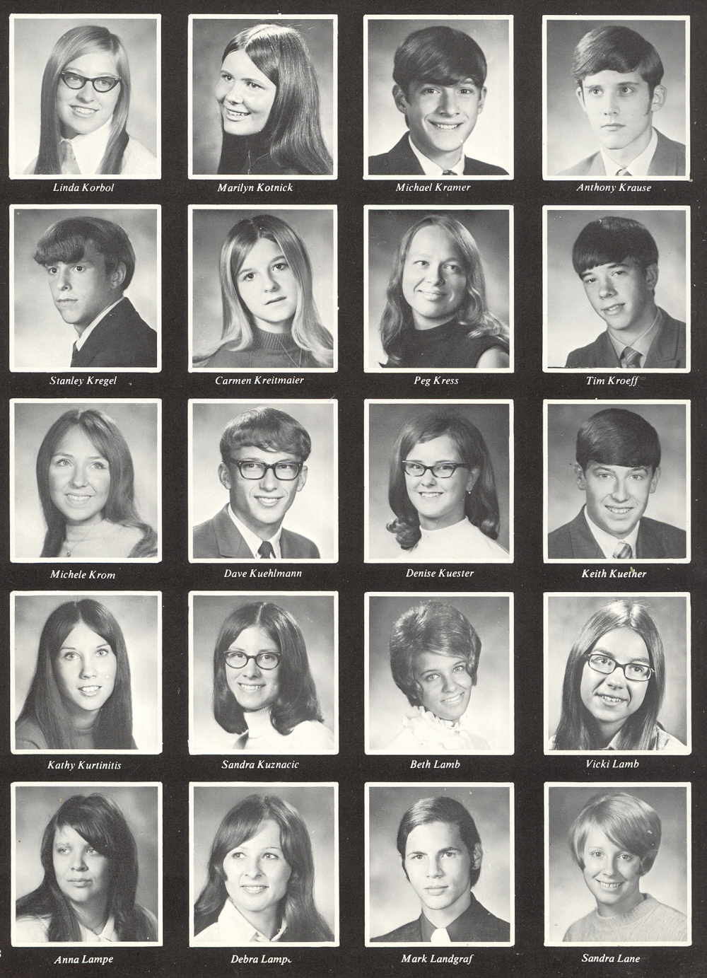 High School, Pages 128 & 143: Linda Korbol, Marilyn Kotnick, Michael Kramer, Anthony Krause, Stanley Kregel, Carmen Kreitmaier, Peg Kress, Tim Kroeff, Michele Krom, Dave Kuehlmann, Denise Kuester, Keith Kuether, Kathy Kurtinitis, Sandra Kuznacic, Beth Lamb, Vicki Lamb, Anna Lampe, Debra Lampe, Mark Landgraf, Sandra Lane.