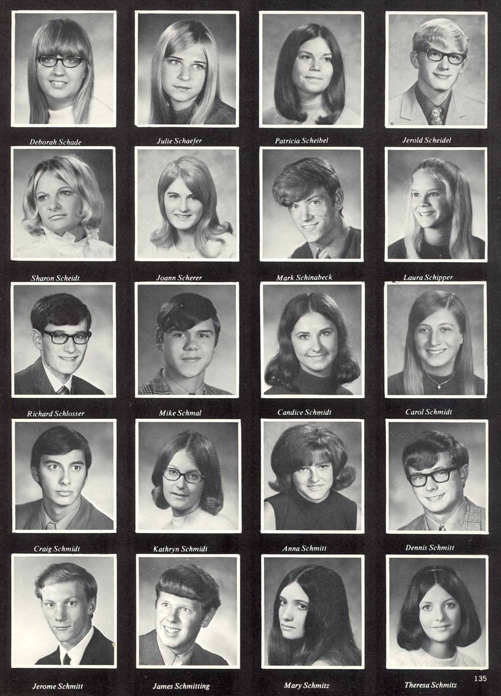 High School, Pages 135, 144 & 145: Deborah Schade, Julie Schaefer, Patricia Scheibel, Jerold Scheidel, Sharon Scheidt, Joann Scherer, Mark Schinabeck, Laura Schipper, Richard Schlosser, Mike Schmahl, Candice Schmidt, Carol Schmidt, Craig Schmidt, Kathryn Schmidt, Anna Schmitt, Dennis Schmitt, Jerome Schmitt, James Schmitting, Mary Schmitz, Theresa Schmitz.