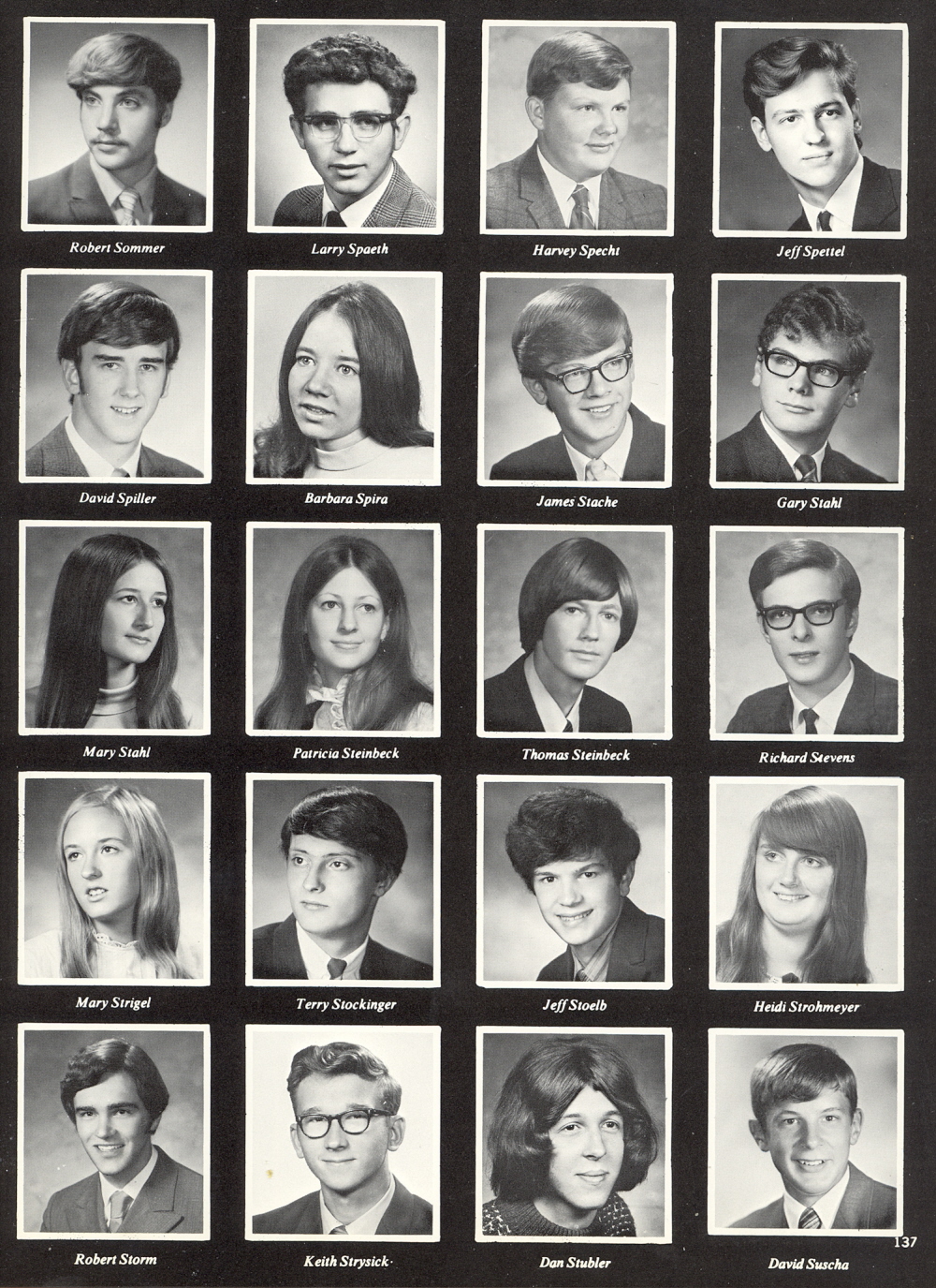 High School, Pages 137 & 145: Robert Sommer, Larry Spaeth, Harvey Specht, Jeff Spettel, David Spiller, Barbara Spira, James Stache, Gary Stahl, Mary Stahl, Patricia Steinbeck, Thomas Steinbeck, Richard Stevens, Mary Strigel, Terry Stockinger, Jeff Stoelb, Heidi Strohmeyer, Robert Storm, Keith Strysick, Dan Stubler, David Suscha.
