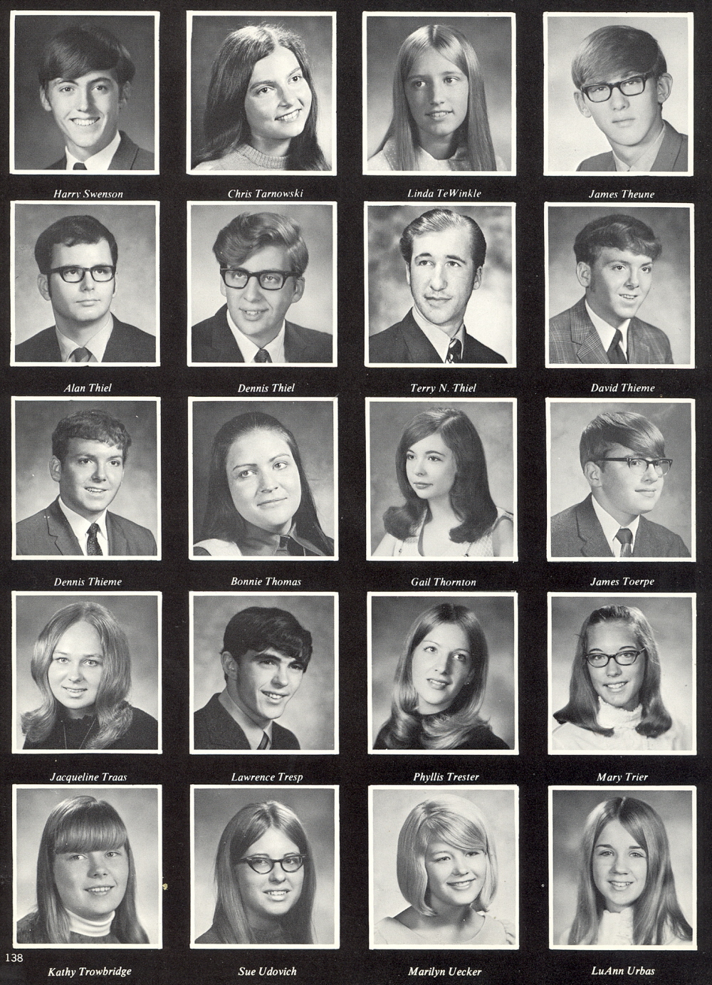 High School, Pages 138 & 145: Harry Swenson, Chris Tarnowski, Linda TeWinkle, James Theune, Alan Thiel, Dennis Thiel, Terry N. Thiel, David Thieme, Dennis Thieme, Bonnie Thomas, Gail Thornton, James Toerpe, Jacqueline Traas, Lawrence Tresp, Phyllis Trester, Mary Trier, Kathy Trowbridge, Sue Udovich, Marilyn Uecker, LuAnn Urbas.