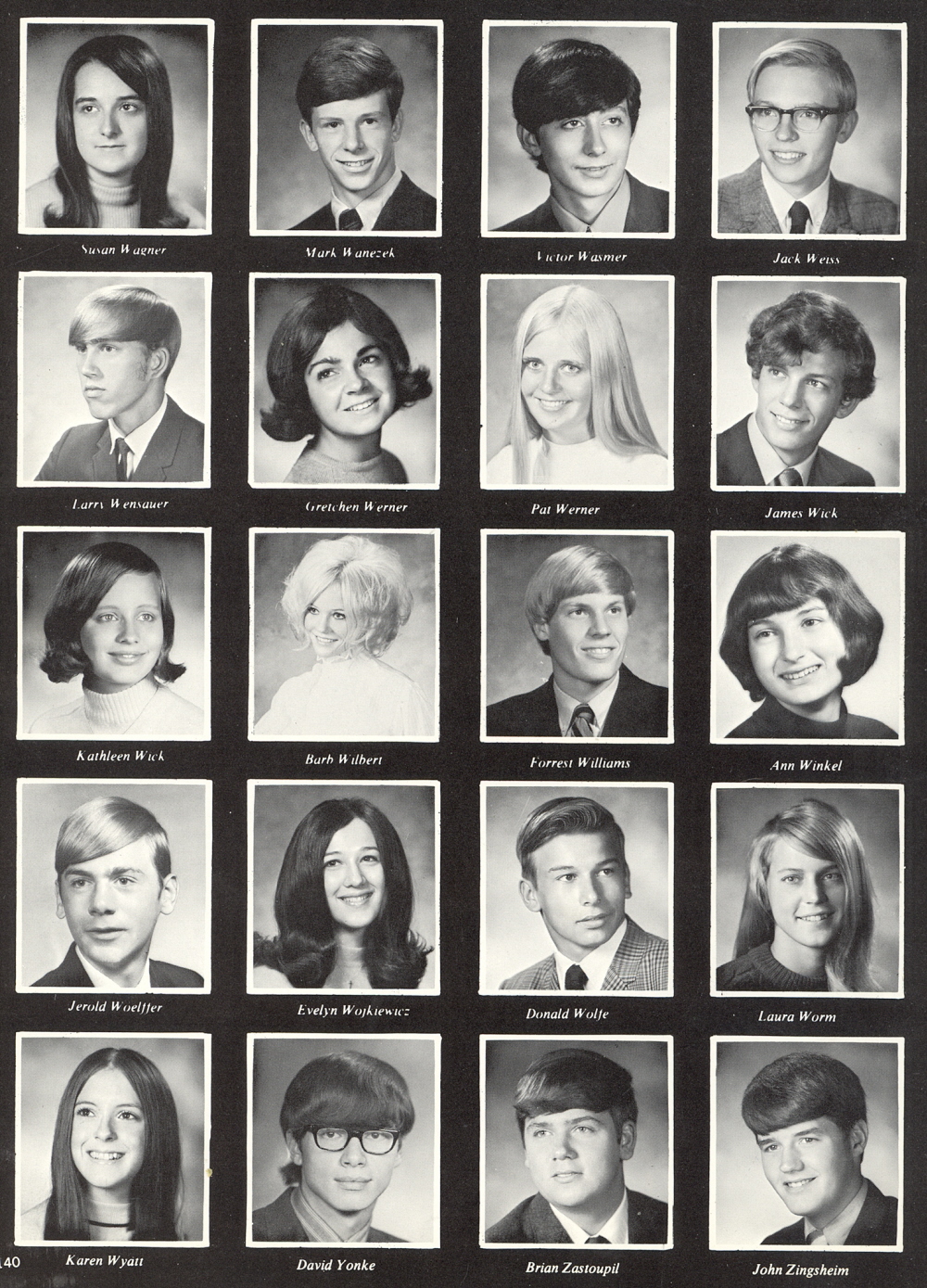 High School, Pages 140 & 145: Susan Wagner, Mark Wanezek, Victor Wasmer, Jack Weiss, Larry Wensauer, Gretchen Werner, Pat Werner, James Wick, Kathleen Wick, Barb Wilbert, Forrest Williams, Ann Winkel, Jerold Woelffer, Evelyn Wojkiewicz, Donald Wolfe, Laura Worm, Karen Wyatt, David Yonke, Brian Zastoupil, John Zingsheim.