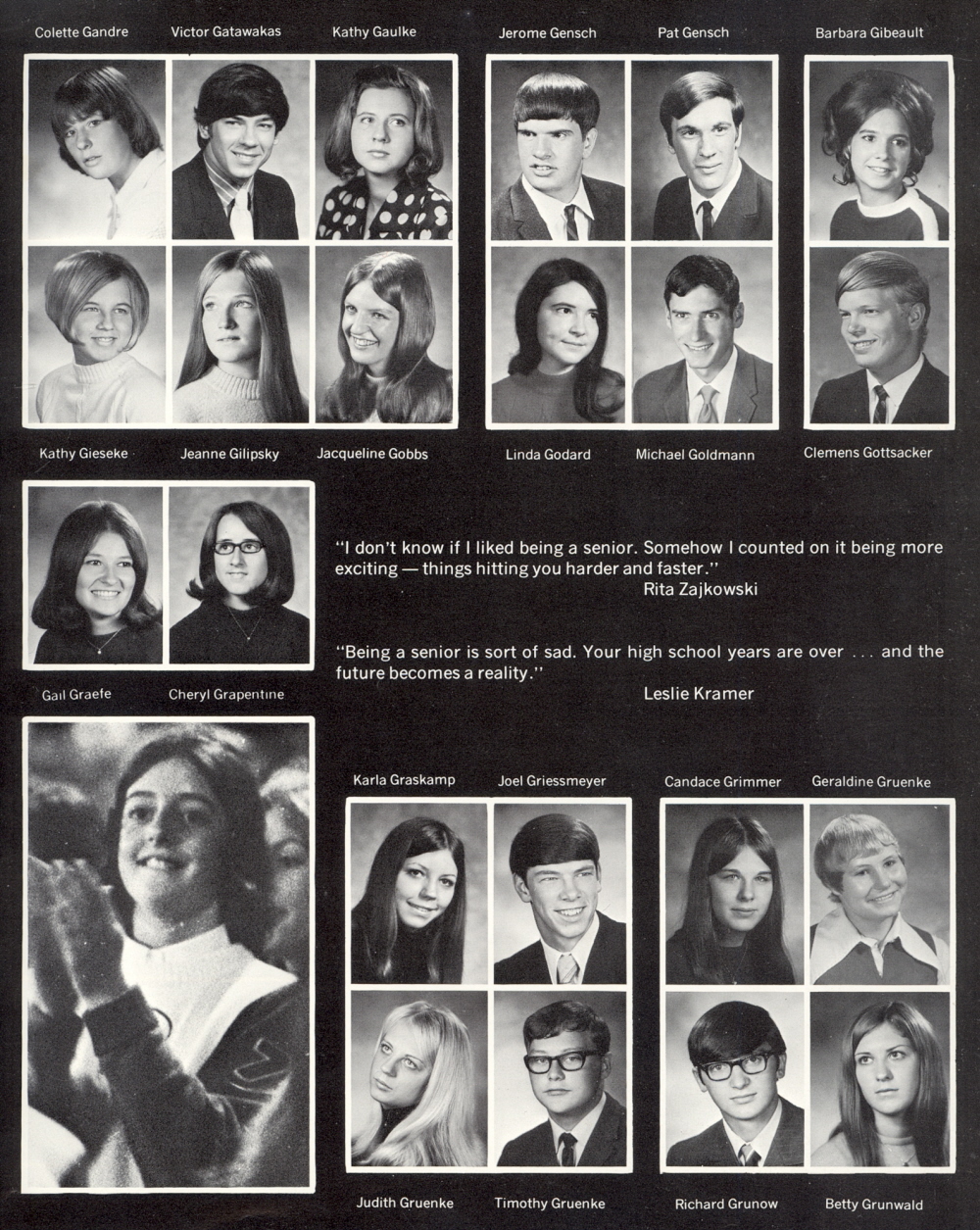 High School, Page 15: Colette Gandre, Victor Gatawakas, Kathy Gaulke, Jerome Gensch, Pat Gensch, Barbara Gibeault, Kathy Gieseke, Jeanne Gilipsky, Jacqueline Gobbs, Linda Godard, Michael Goldmann, Clemens Gottsacker, Gail Graefe, Cheryl Grapentine, Karla Graskamp, Joel Griessmeyer, Candace Grimmer, Geraldine Gruenke, Judith Gruenke, Timothy Gruenke, Richard Grunow, Betty Grunwald.
