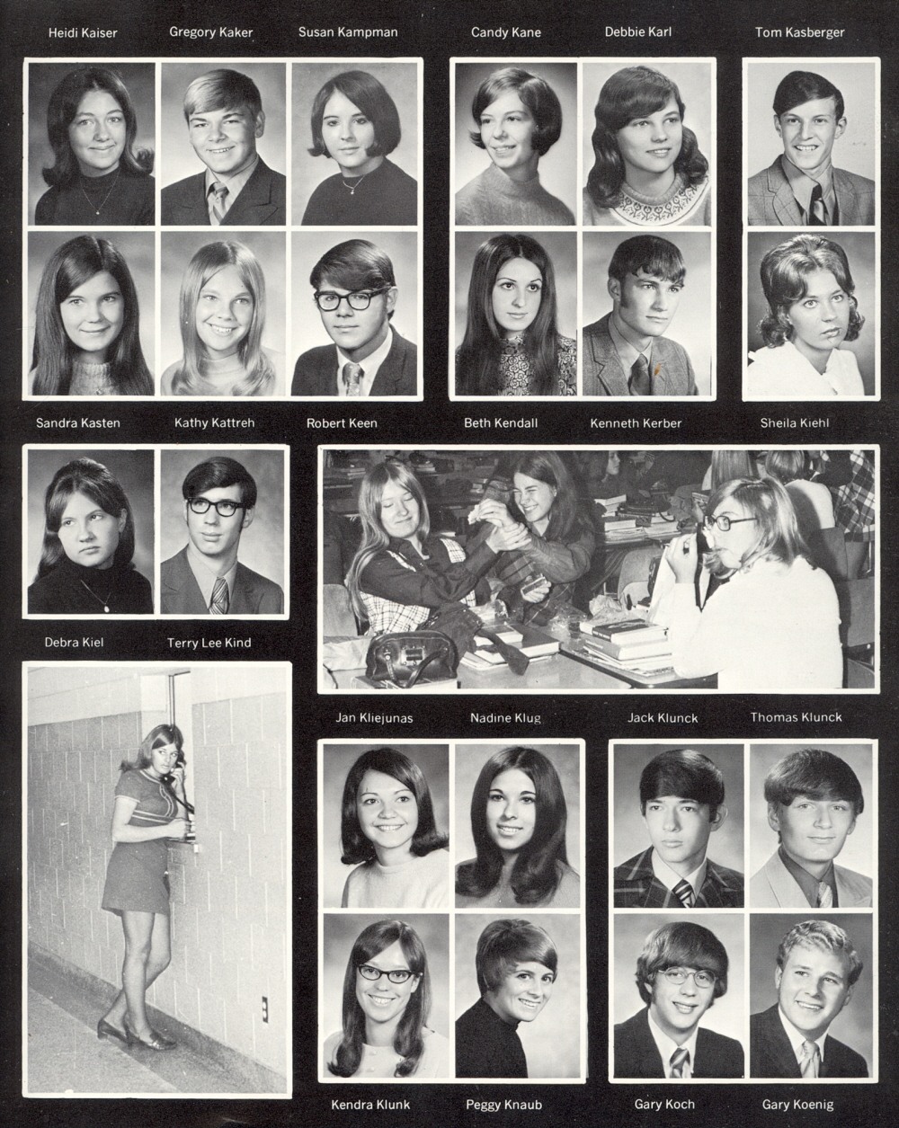 High School, Page 19: Heidi Kaiser, Gregory Kaker, Susan Kampman, Candy Kane, Debbie Karl, Tom Kasberger, Sandra Kasten, Kathy Kattreh, Robert Keen, Beth Kendall, Kenneth Kerber, Sheila Kiehl, Debra Kiel, Terry Lee Kind, Jan Kliejunas, Nadine Klug, Jack Klunck, Thomas Klunck, Kendra Klunk, Peggy Knaub, Gary Koch, Gary Koenig.