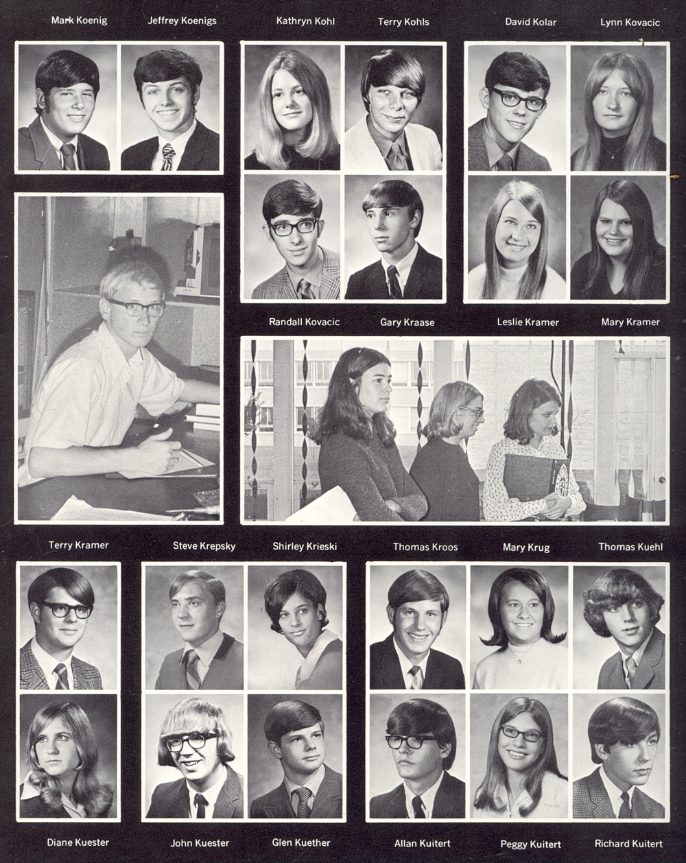 High School, Page 20: Mark Koenig, Jeffrey Koenigs, Kathryn Kohl, Terry Kohls, David Kolar, Lynn Kovacic, Randall Kovacic, Gary Kraase, Leslie Kramer, Mary Kramer, Terry Kramer, Steve Krepsky, Shirley Krieski, Thomas Kroos, Mary Krug, Thomas Kuehl, Diane Kuester, John Kuester, Glen Kuether, Allan Kuitert, Peggy Kuitert, Richard Kuitert.