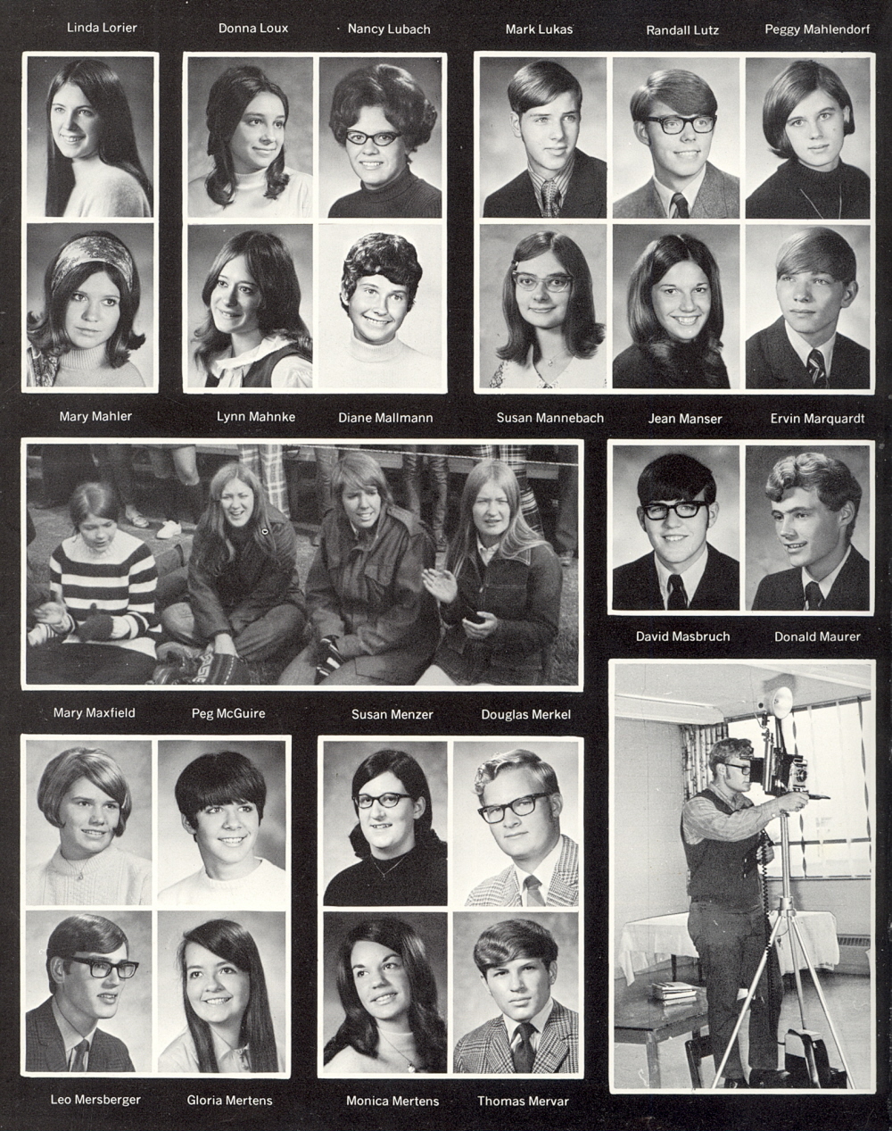 High School, Page 22: Linda Lorier, Donna Loux, Nancy Lubach, Mark Lukas, Randall Lutz, Peggy Mahlendorf, Mary Mahler, Lynn Mahnke, Diane Mallmann, Susan Mannebach, Jean Manser, Ervin Marquardt, David Masbruch, Donald Maurer, Mary Maxfield, Peg McGuire, Susan Menzer, Douglas Merkel, Leo Mersberger, Gloria Mertens, Monica Mertens, Thomas Mervar.
