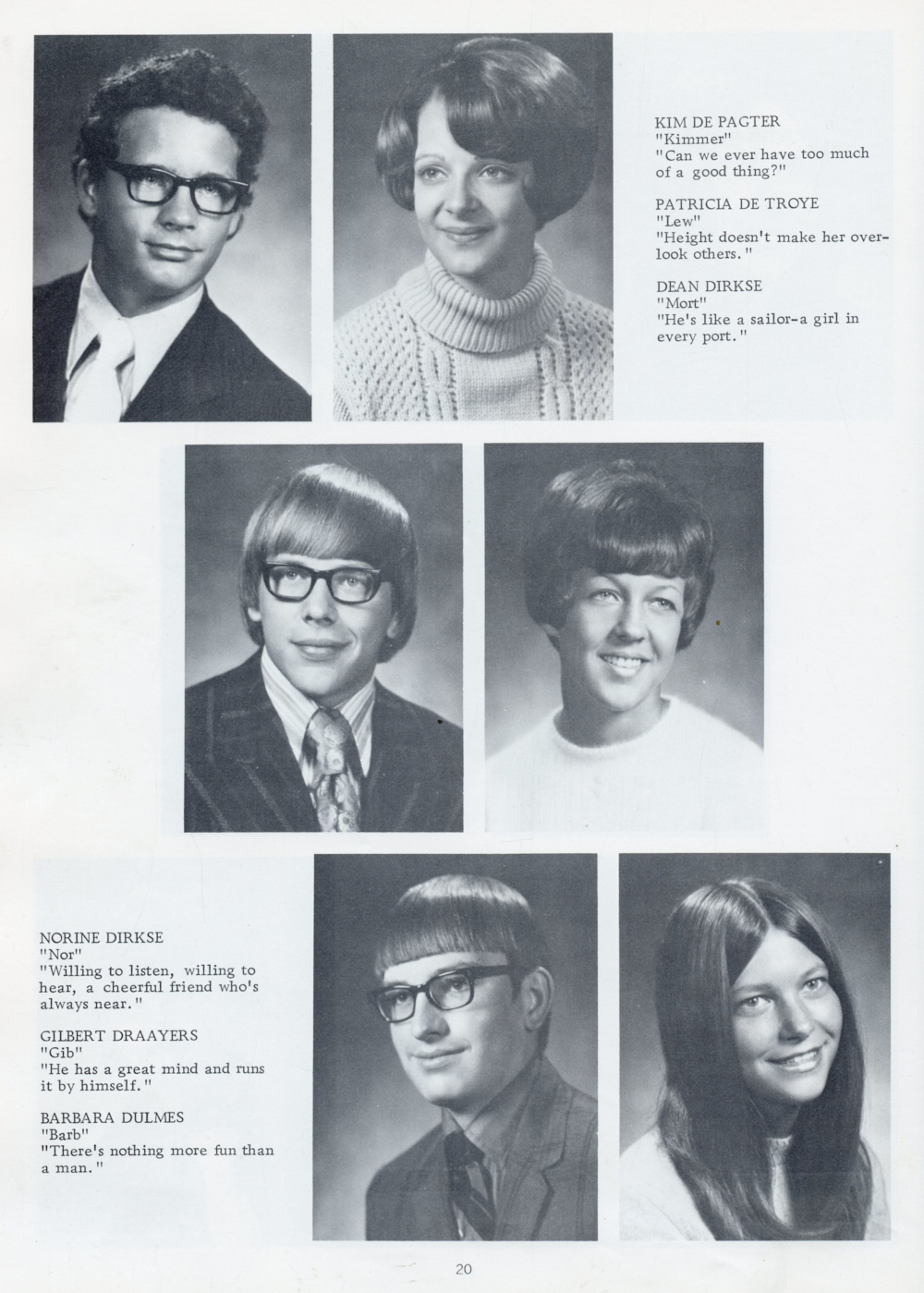 1972 Oostburg High School Yearbook Page 20: Kim De Pagter, Patricia De Troye, Dean Dirkse, Norine Dirkse, Gilbert Draayers, Barbara Dulmes.