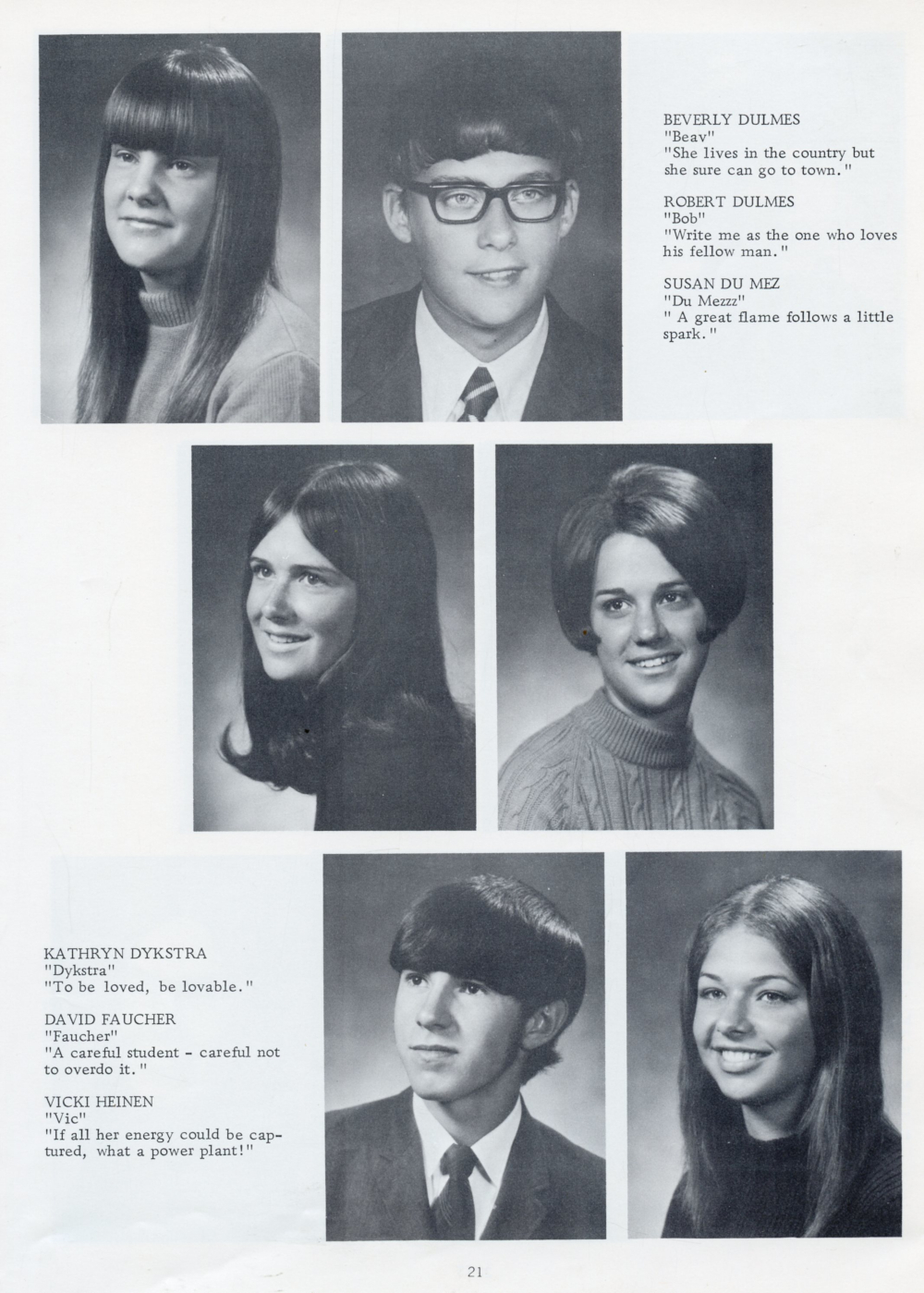 1972 Oostburg High School Yearbook Page 21: Beverly Dulmes, Robert Dulmes, Susan Du Mez, Kathryn Dykstra, David Faucher, Vicki Heinen.