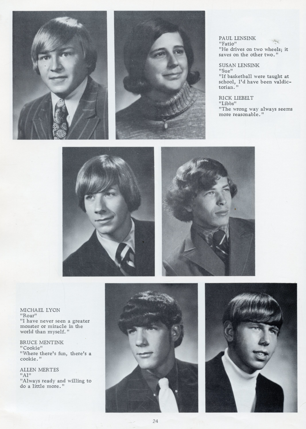 1972 Oostburg High School Yearbook Page 24: Paul Lensink, Susan Lensink, Rick Liebelt, Michael Lyon, Bruce Mentink, Allen Mertes.