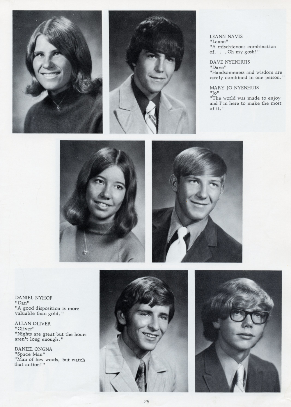 1972 Oostburg High School Yearbook Page 25: Leann Navis, Dave Nyenhuis, Mary Jo Nyenhuis, Daniel Nyhof, Allan Oliver, Daniel Ongna.