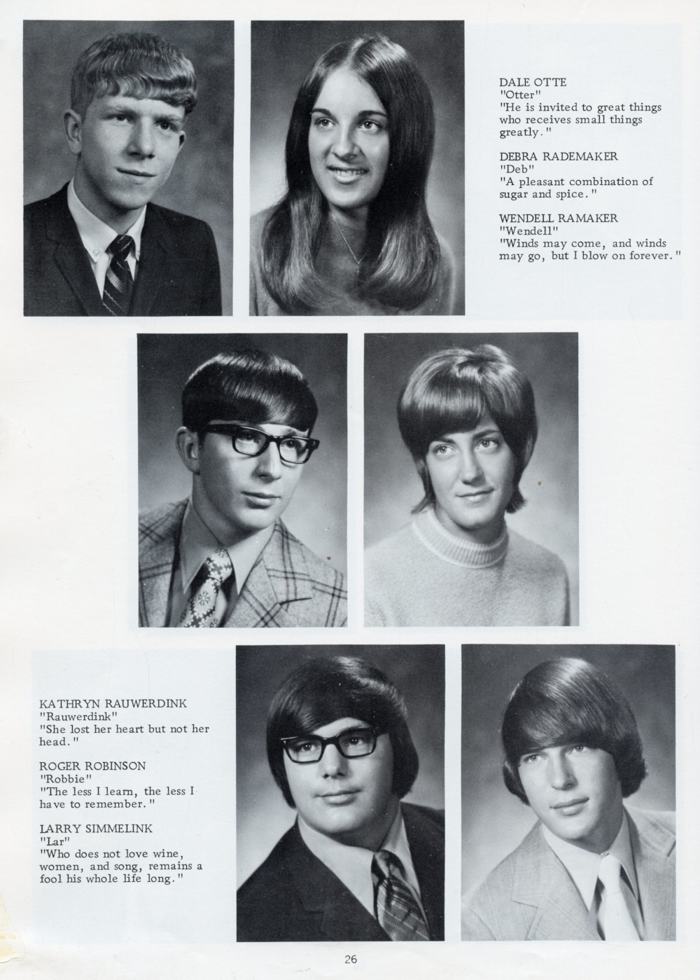 1972 Oostburg High School Yearbook Page 26: Dale Otte, Debra Rademaker, Wendell Ramaker, Kathryn Rauwerdink, Roger Robinson, Larry Simmelink.