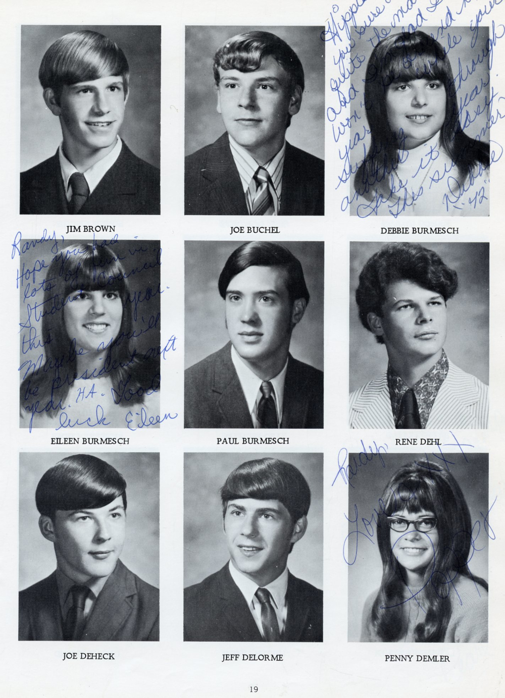 1972 Random Lake High School Yearbook Page 19: Jim Brown, Joe Buchel, Debbie Burmesch, Eileen Burmesch, Paul Burmesch, Rene Dehl, Joe Deheck, Jeff Delorme, Pemmy Demler.