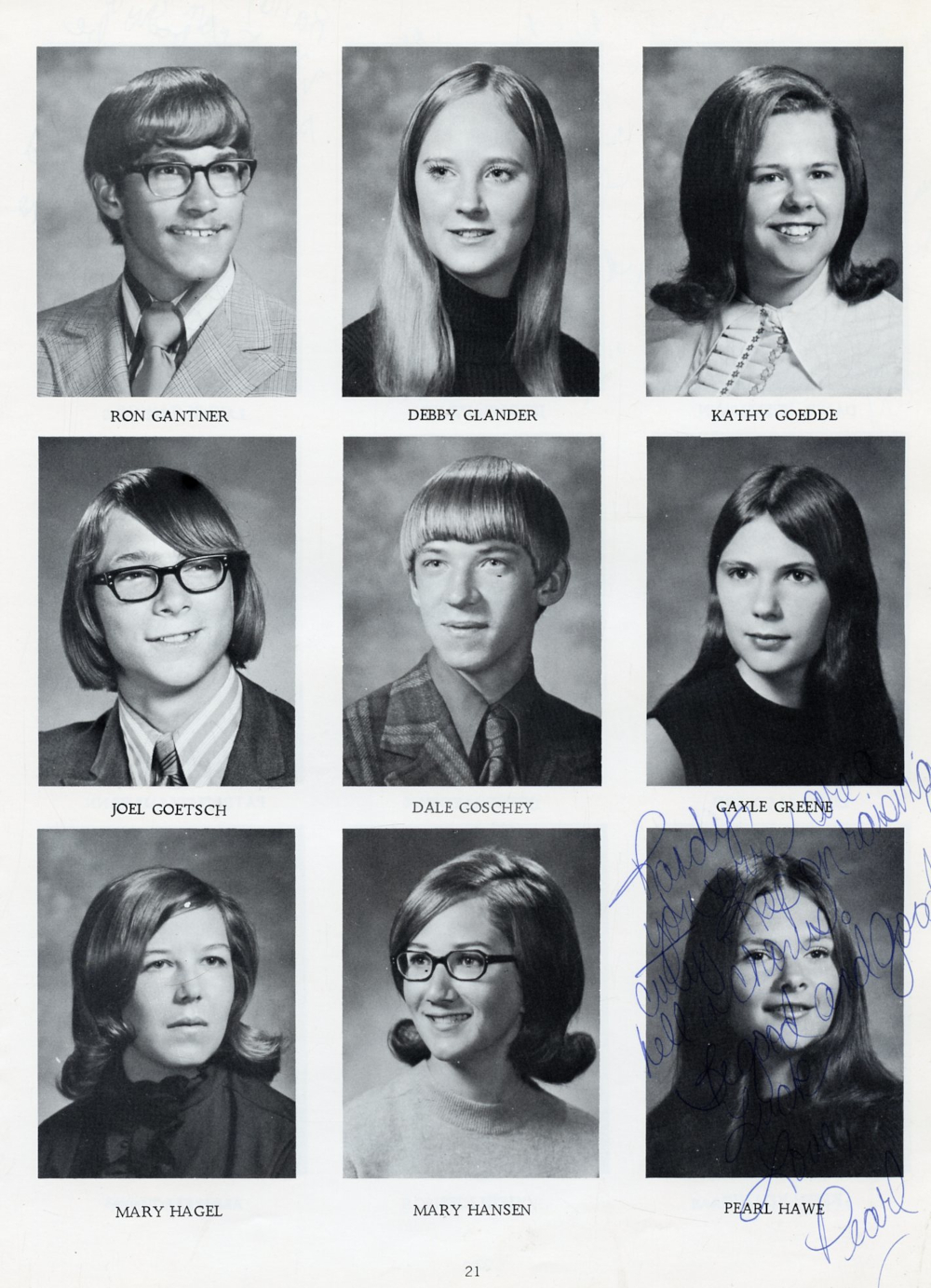 1972 Random Lake High School Yearbook Page 21: Ron Gantner, Debby Glander, Kathy Goedde, Joel Goetsch, Dale Coschey, Gayle Greene, Mary Hagel, Mary Hansen, Pearl Hawe.