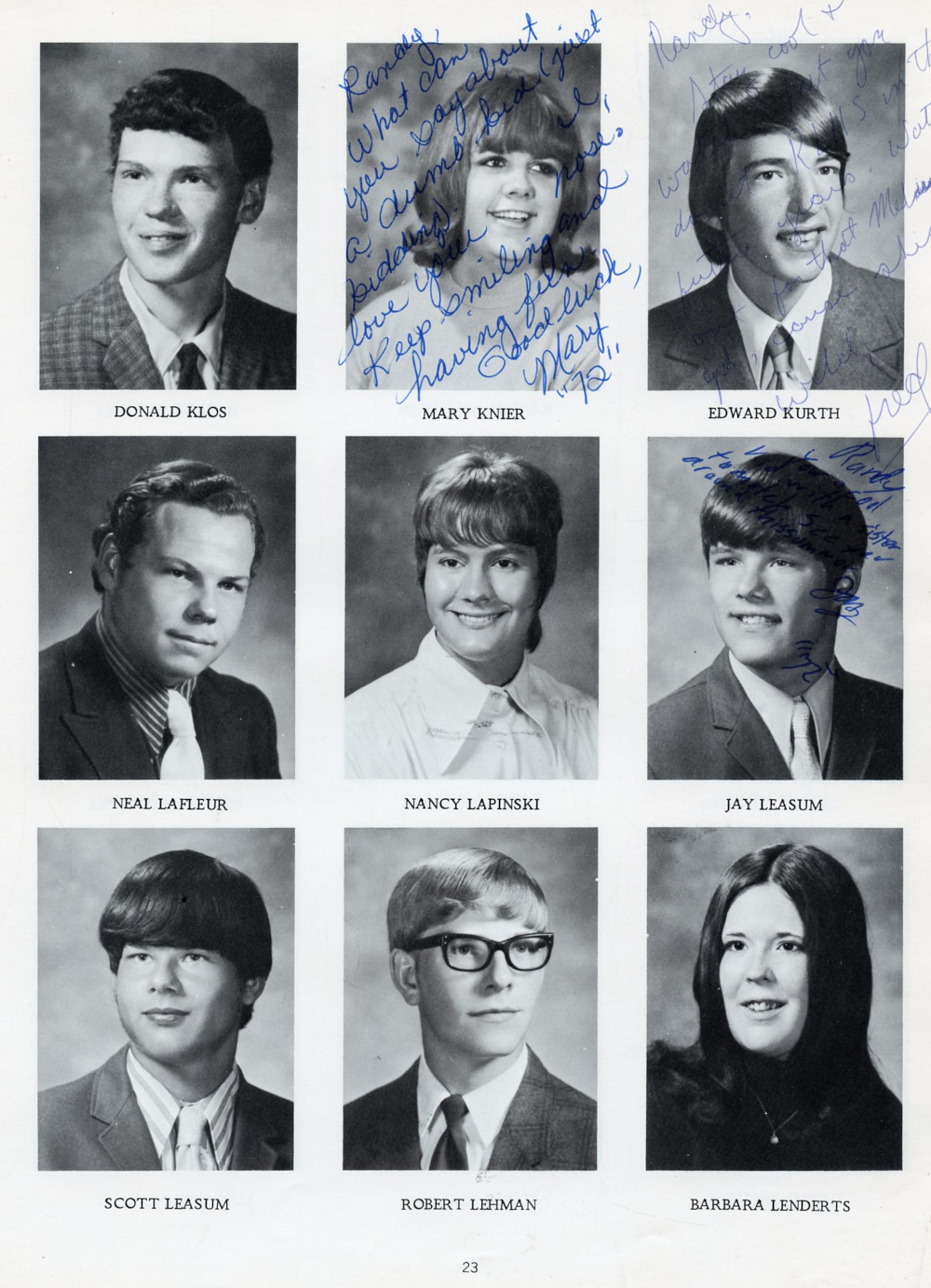 1972 Random Lake High School Yearbook Page 23: Donald Klos, Mary Knier, Edward Kurth, Neal Lafleur, Nancy Lapinski, Jay Leasum, Scott Leasum, Robert Lehman, Barbara Lenderts.