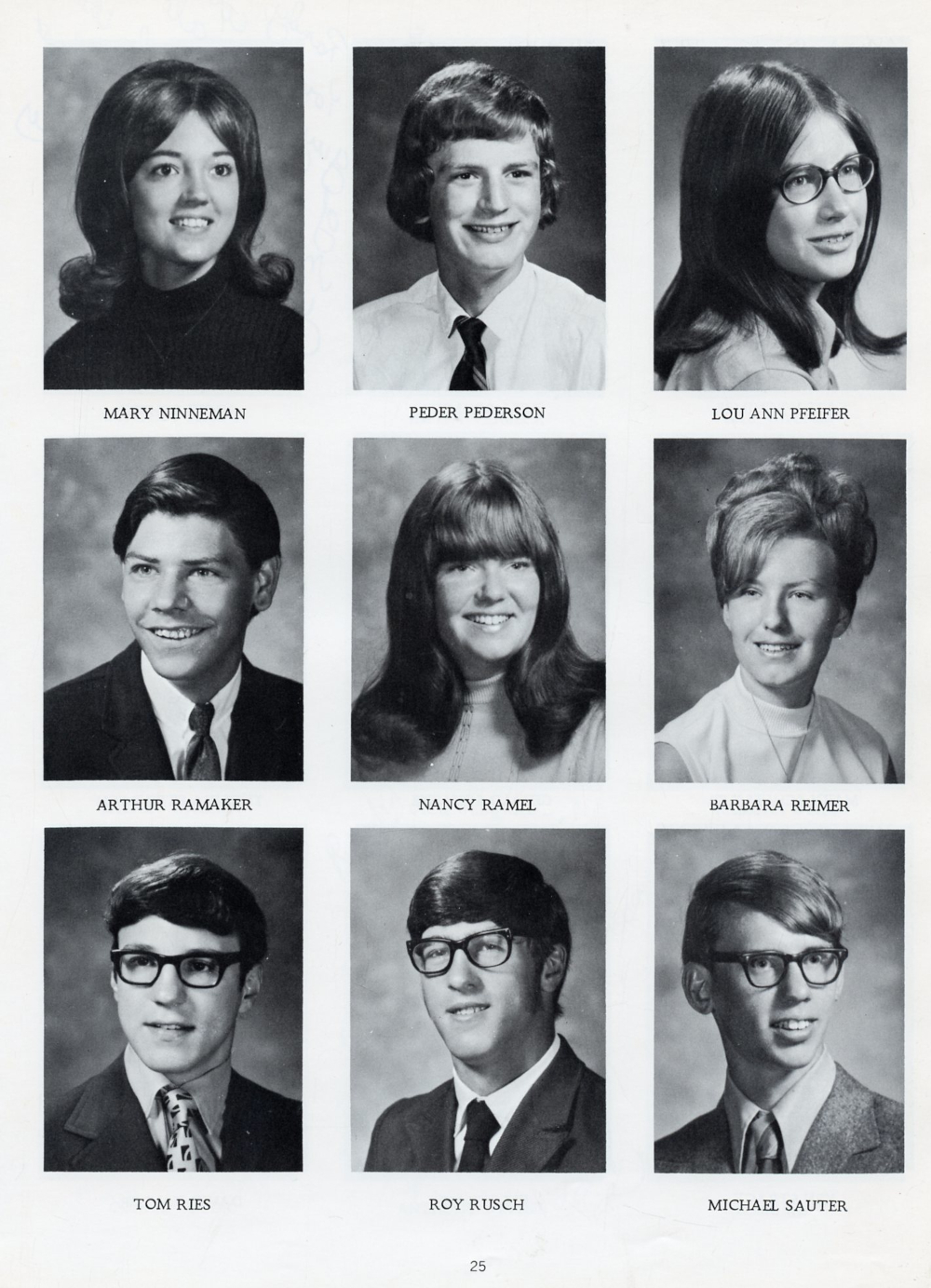 1972 Random Lake High School Yearbook Page 25: Mary Ninneman, Peder Pederson, Lou Ann Pfeifer, ARthur Ramaker, Nancy RAmel, Barbara Reimer, Tom Ries, Roy Rusch, Michael Sauter.