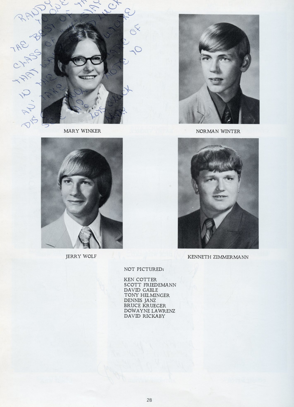 1972 Random Lake High School Yearbook Page 28: Mary Winker, Norman Winter, Jerry Wolf, Kenneth Zimmermann, Ken Cotter, Scott Friedemann, David Gable, Tony Helminger, Dennis Janz, Bruce Krueger, Dowayne Lawrenz, David Rickaby.
