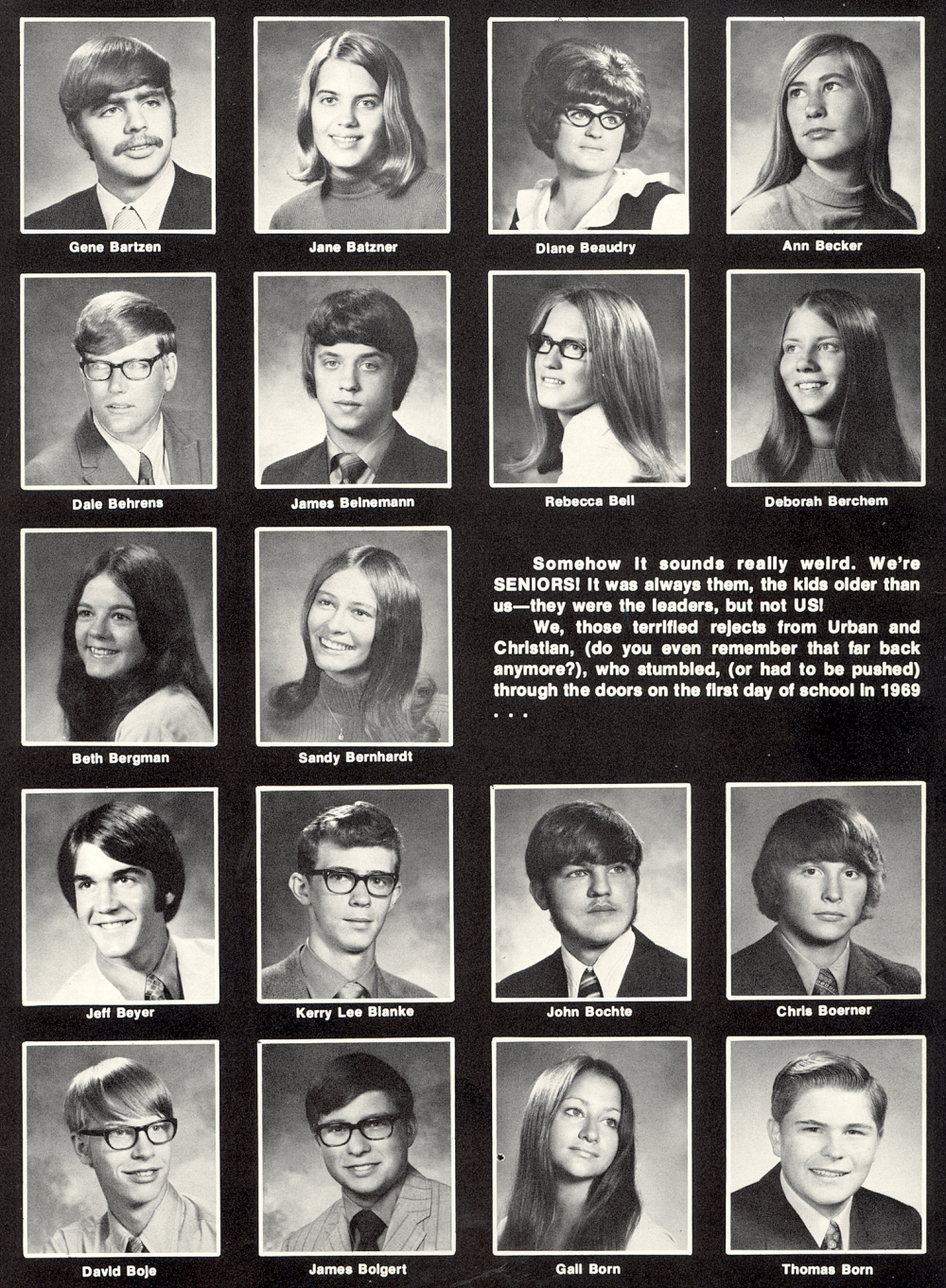 1972 Sheboygan North High School, Page 123: Gene Bartzen, Jane Batzner, Diane Beaudry, Ann Becker, Dale Behrena, James Belnemann, Rebecca Bell, Deborah Berchem, Beth Bergman, Sandy Bernhardt, Jeff Beyer, Kerry Blanke, John Bochte, Chris Goerner, David Boje, Jamer Bolgert, Gail Born, Thomas Born.