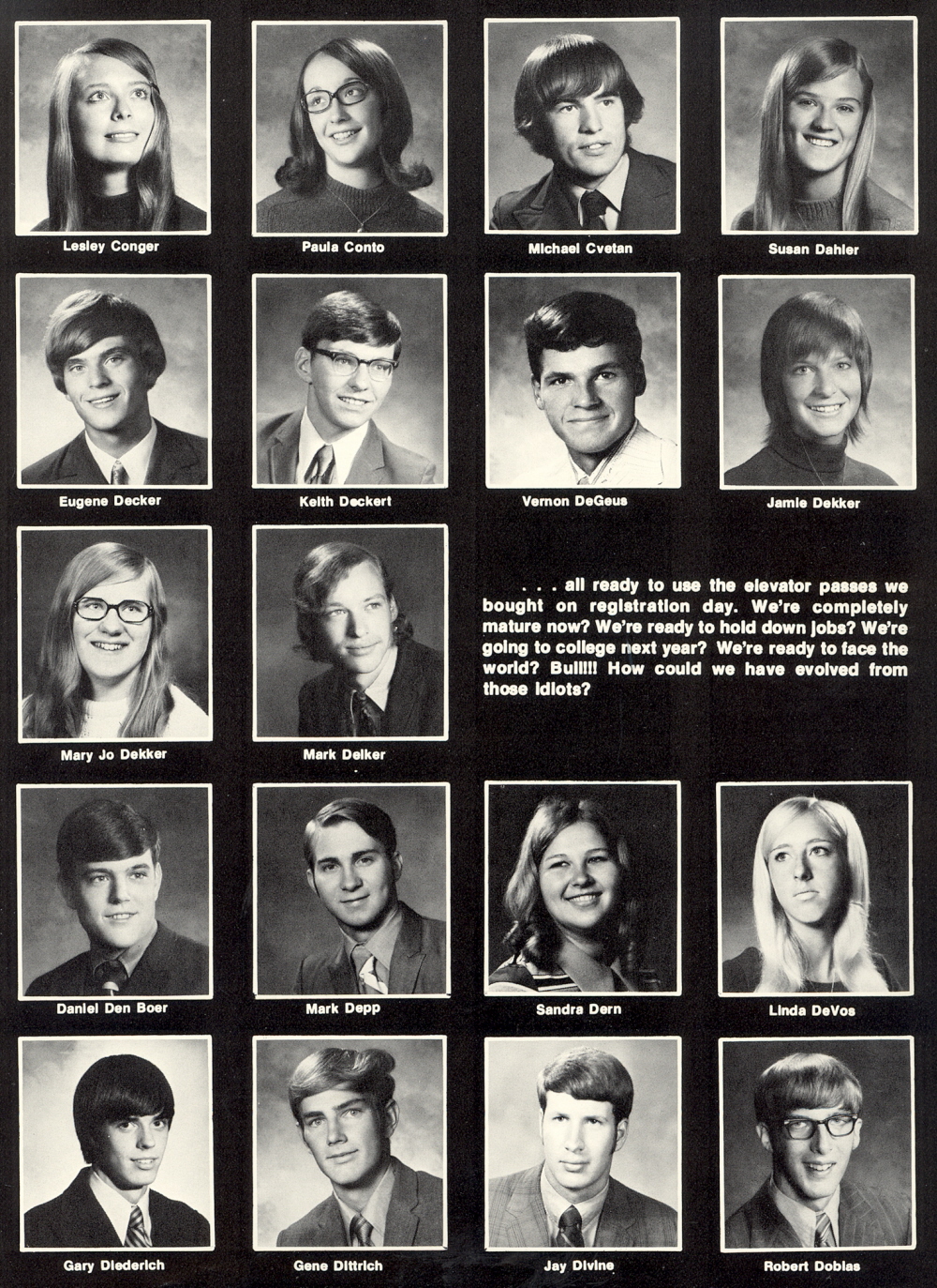 1972 Sheboygan North High School, Page 125: Lesley Conger, Paula Conto, Michael Cvetan, Susan Dahler, Eugene Decker, Keith Deckert, Vernon DeGeus, Jamie Dekker, Mary Jo Dekker, Mark Delker, Daniel Den Boer, Mark Depp, Sandra Dern, Linda DeVos, Gary Diederich, Gene Dittrich, Jay Divine, Robert Doblas.