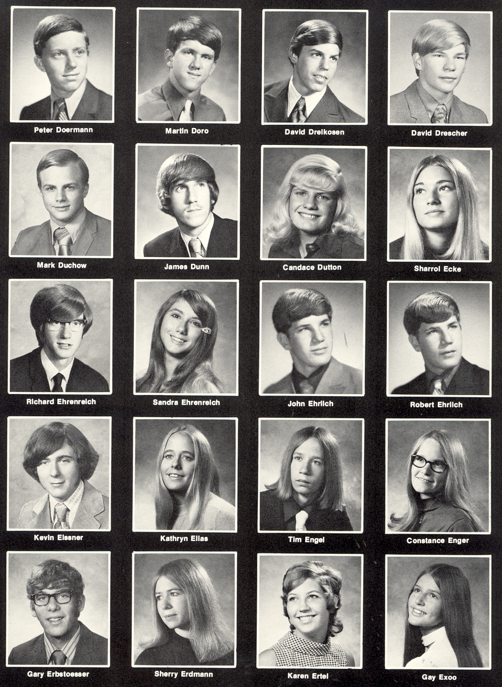 1972 Sheboygan North High School, Page 126: Peter Doermann, Martin Doro, David Drelkosen, David Drescher, Mark Duchow, James Dunn, Candace Dutton, Sharrol Ecke, Richard Ehrenreich, Sandra Ehrenreich, John Ehrlich, Robert Ehrlich, Kevin Eissner, Kathryn Ellas, Tim Engel, Constance Enger, Gary Erbstoesser, Sherry Erdmann, Karen Ertel, Gay Exoo.