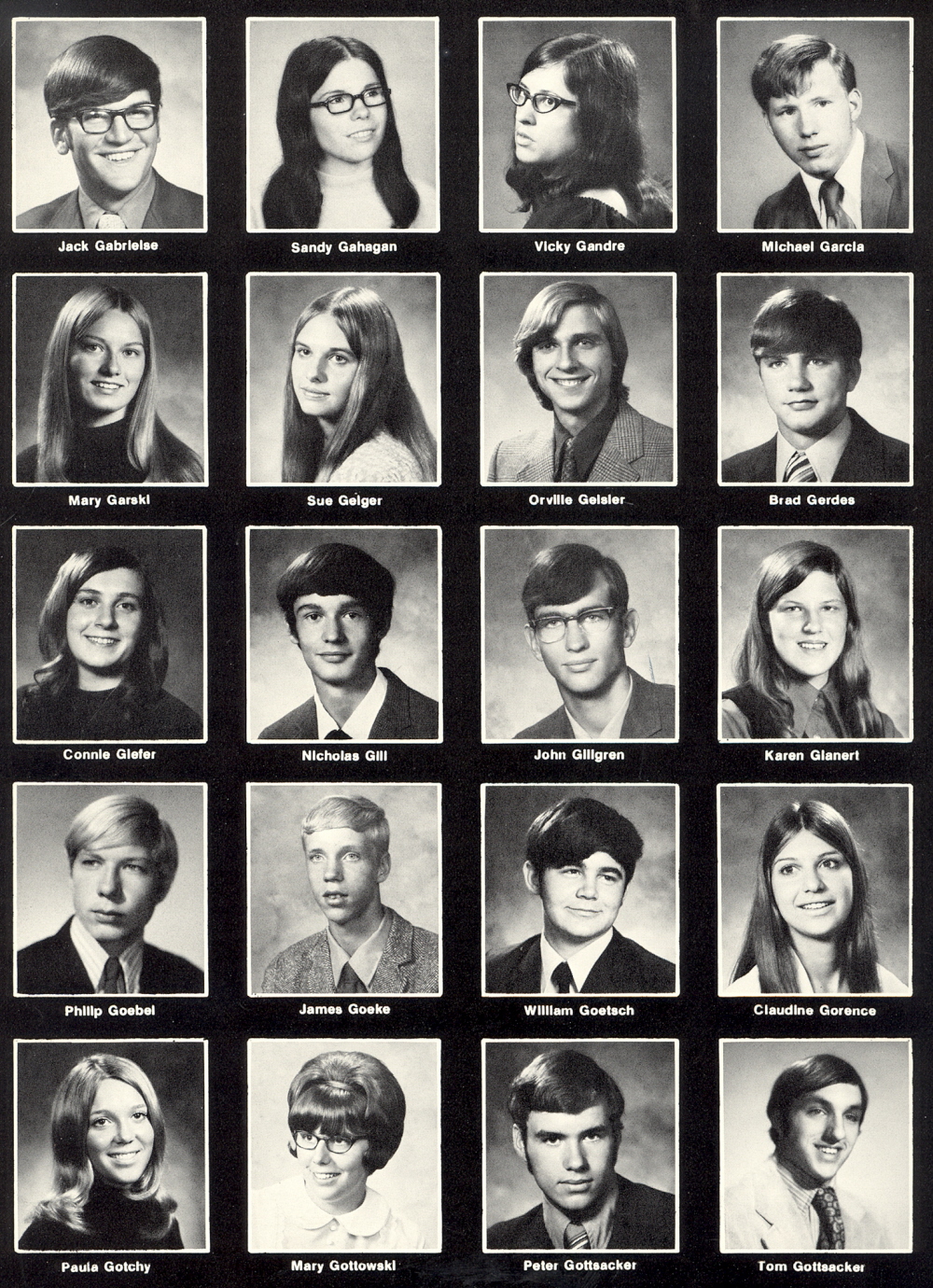 1972 Sheboygan North High School, Page 128: Jack Gabrielse, Sandy Gahagan, Vicky Gandre, Michael Garcia, Mary Garski, Sue Geiger, Orville Geisler, Brad Gerdes, Connie Giefer, Nicholas Gill, John Gillgren, Karen Gianert, Phillip Goebel, James Goeke, William Goetsch, Claudine Gorence, Paula Gotchy, Mary Gottowski, Peter Gottsacker, Tom Gottsacker.