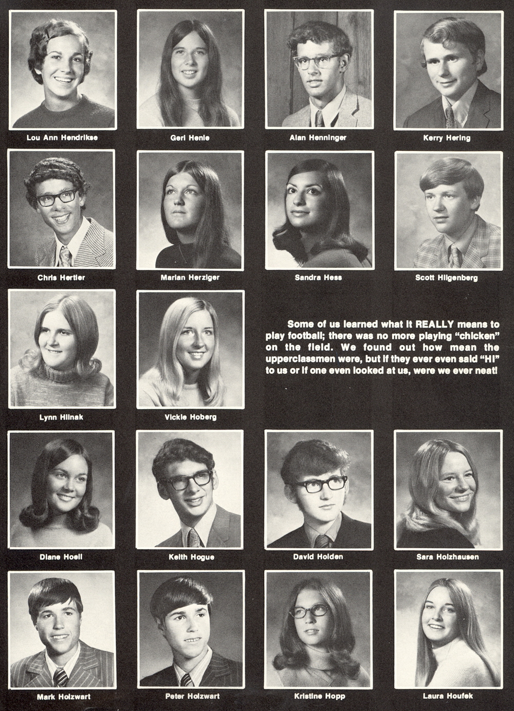 1972 Sheboygan North High School, Page 131: Lou Ann Hendrikse, Geri Henie, Alan Henninger, Kerry Herling, Chris Hertler, Marian Herziger, Sandra Hess, Scott Hilgenberg, Lynn Hlinak, Vickie Hoberg, Diane Hoell, Keith Hogue, David Holden, Sara Holzhausen, Mark Holzwart, Peter Holzwart, Kristine Hopp, Laura Houfek.