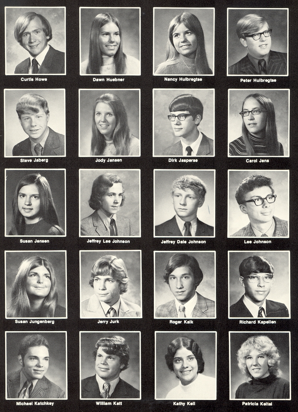 1972 Sheboygan North High School, Page 132: Curtis Howe, Dawn Huebner, Nancy Hulbregtse, Peter Hulbregtse, Steve Jaberg, Jody Jensen, Dirk Jesperse, Carol Jens, Susan Jensen, Jeffrey Lee Johnson, Jeffrey Dale Johnson, Lee Johnson, Susan Jungenberg, Jerry Jurk, Roger Kalk, Richard Kapellen, Michael Katchkey, William Katt, Kathy Kell, Patricia Keitel.