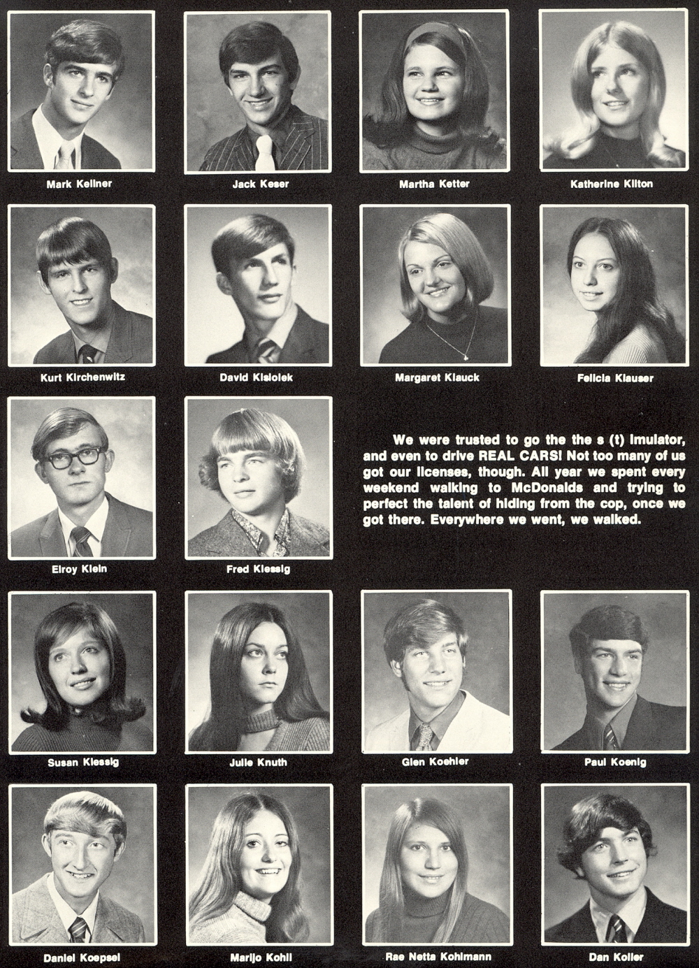 1972 Sheboygan North High School, Page 133: Mark Kellner, Jack Keser, Martha Ketter, Katherine Kilton, Kurt Kirchenwitz, David Kisiolek, Margaret Klauck, Felicia Klauser, Elroy Klein, Fred Klessig, Susan Klessig, Julie Knuth, Glen Koehler, Paul Koenig, Daniel Koepsel, Marijo Kohll, Rae Kohlmann, Dan Koller.