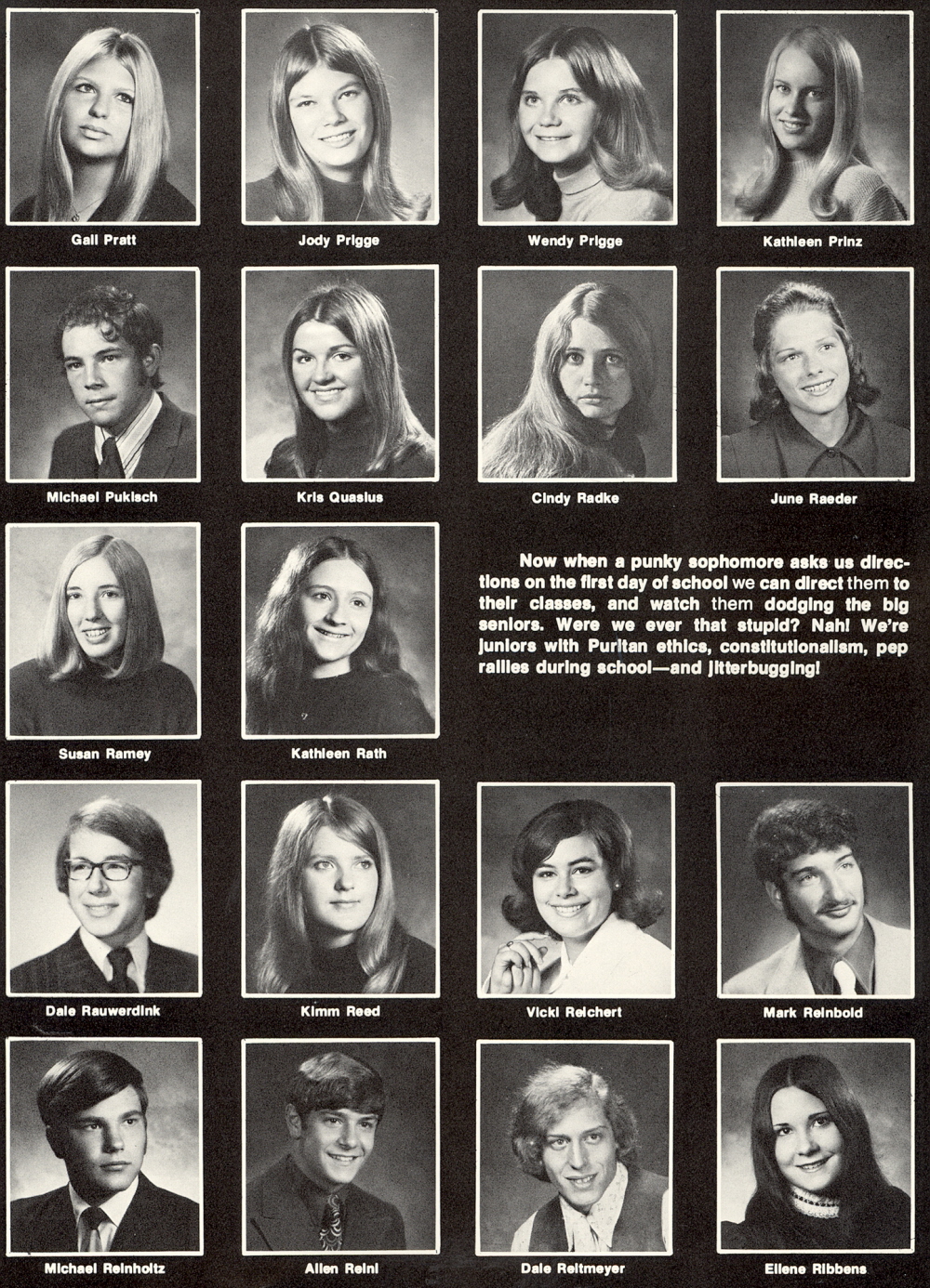 1972 Sheboygan North High School, Page 139: Gail Pratt, Jody Prigge, Wendy Prigge, Kathleen Prinz, Michael Pukisch, Kris Quasius, Cindy Radke, June Raeder, Susan Ramey, Kathleen Rath, Dale Rauwerdink, Kimm Reed, Vicki Reichert, Mark Reinbold, Michael Reinholtz, Allen Reinl, Dale Reltmeyer, Ellene Ribbens.