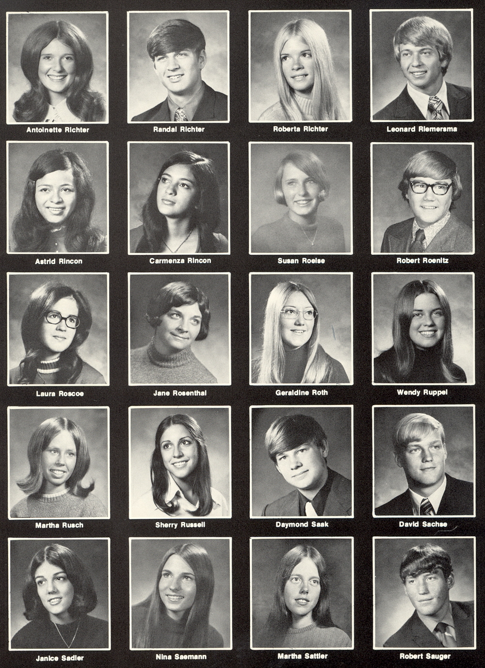 1972 Sheboygan North High School, Page 140: Antoinette Richter, Randal Richter, Roberta Richter, Leonard Riemersma, Astrid Rincon, Carmenza Rincon, Susan Roelse, Robert Roenitz, Laura Roscoe, Jane Rosenthal, Geraldine Roth, Wendy Ruppel, Martha Rusch, Sherry Russell, Daymond Saak, David Sachse, Janice Sadler, Nina Saemann, Martha Sattler, Robert Sauger.