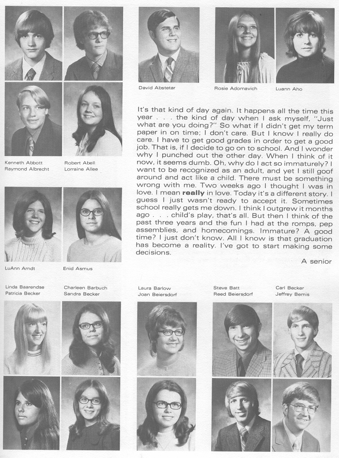 1972 Sheboygan South High School, Page 5: David Abstetar, Rosie Adomevich, Luann Aho, Kenneth Abbott, Robert Abell, Raymond Albrecht, Lorraine Allee, LuAnn Arndt, Enid Asmus, Linda Baarendse, Charleen Barbuch, Laura Barlow, Steve Batt, Carl Becker, Patricia Becker, Sandra Becker, Joan Beiersdorf, Reed Beiersdorf, Jeffrey Bemis.