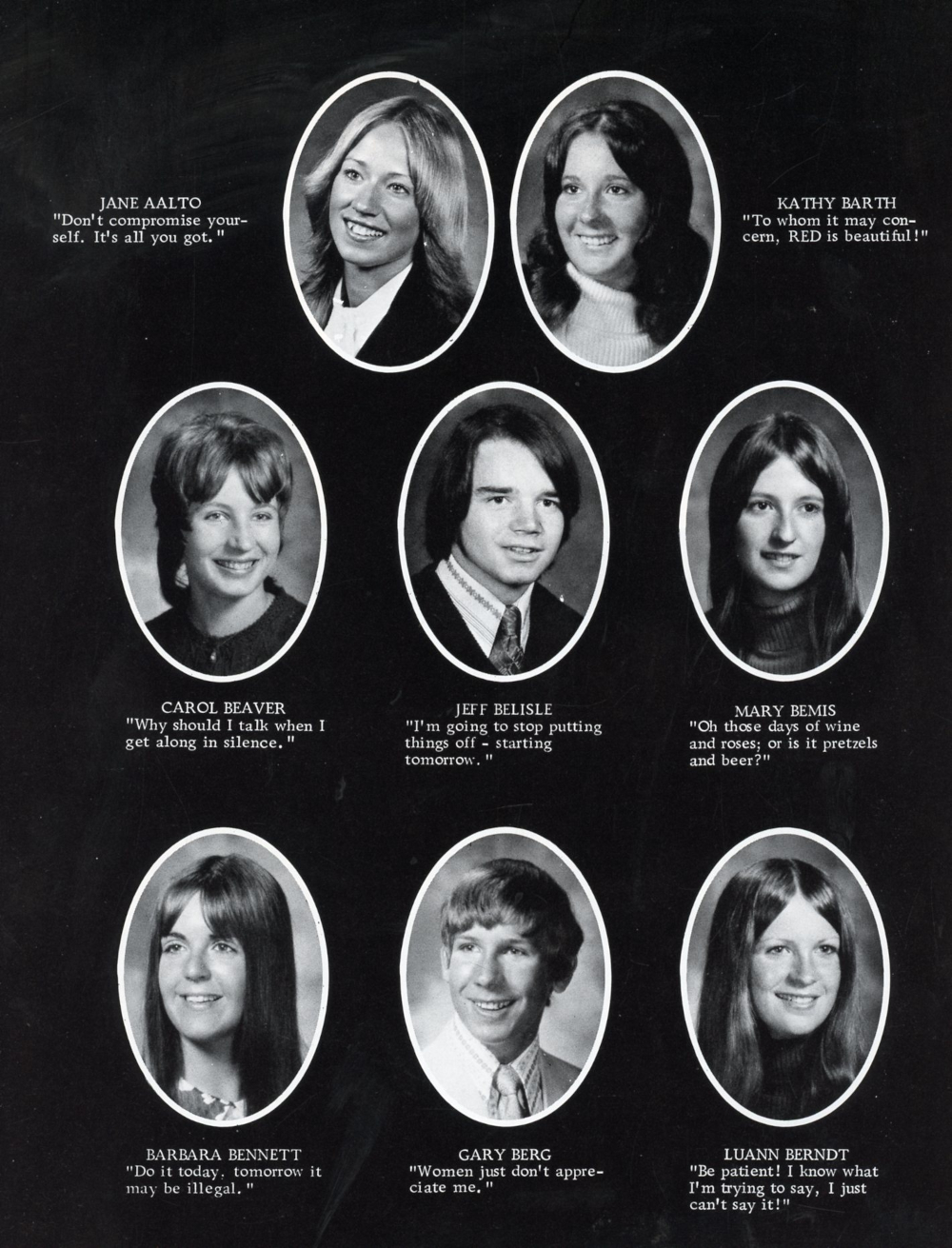 1973 Random Lake High School Yearbook Page 84: Jane Aalto, Kathy Barth, Carol Beaver, Jeff Belisle, Mary Bemis, Barbara Bennett, Gary Berg, Luann Berndt.