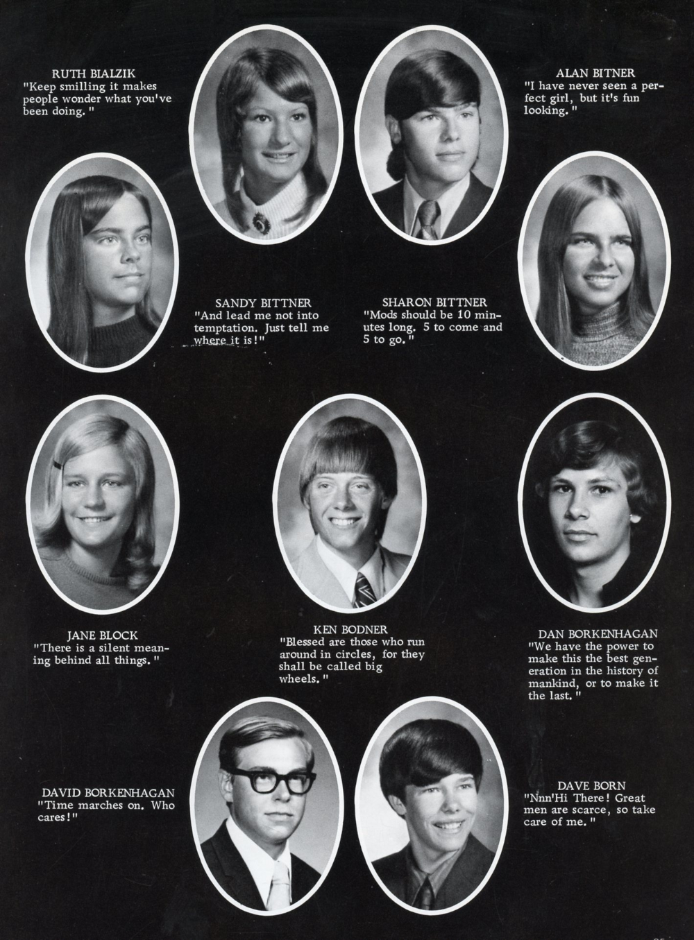1973 Random Lake High School Yearbook Page 85: Ruth Bialzik, Alan Bitner, Sandy Bittner, Sharon Bittner, Jane Block, Ken Bodner, Dan Borkenhagen, David Borkenhagen, Dave Born.