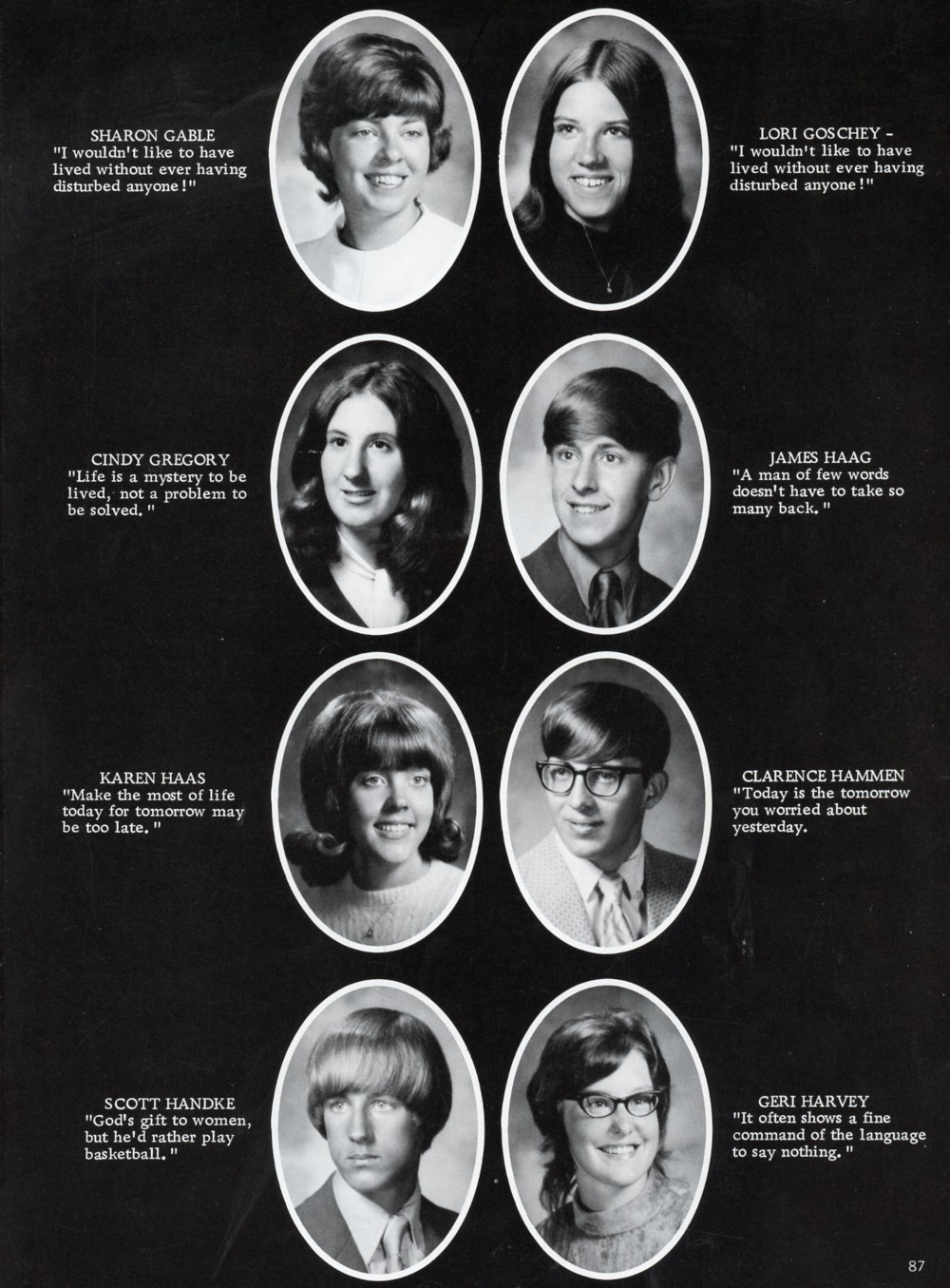 1973 Random Lake High School Yearbook Page 87: Sharon Gable, Lori Goschey, Cindy Gregory, James Haag, Karen Haas, Clarence Hammen, Scott Handke, Geri Harvey.
