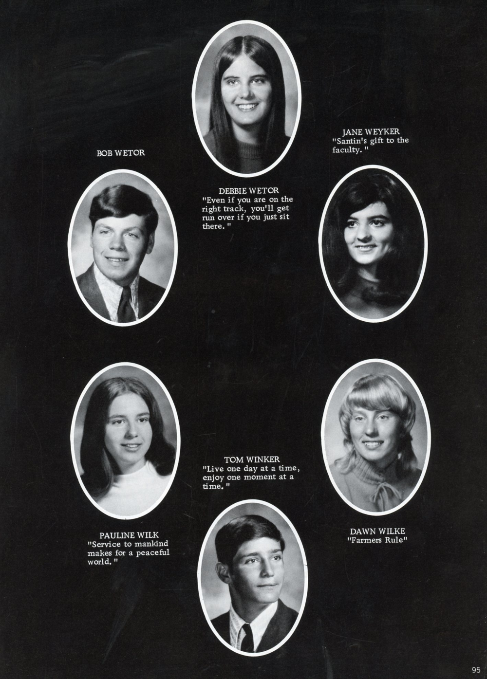 1973 Random Lake High School Yearbook Page 95: Debbie Wetor, Bob Wetor, Jane Weyker, Pauline Wilk, Dawn Wilke, Tom Winker.