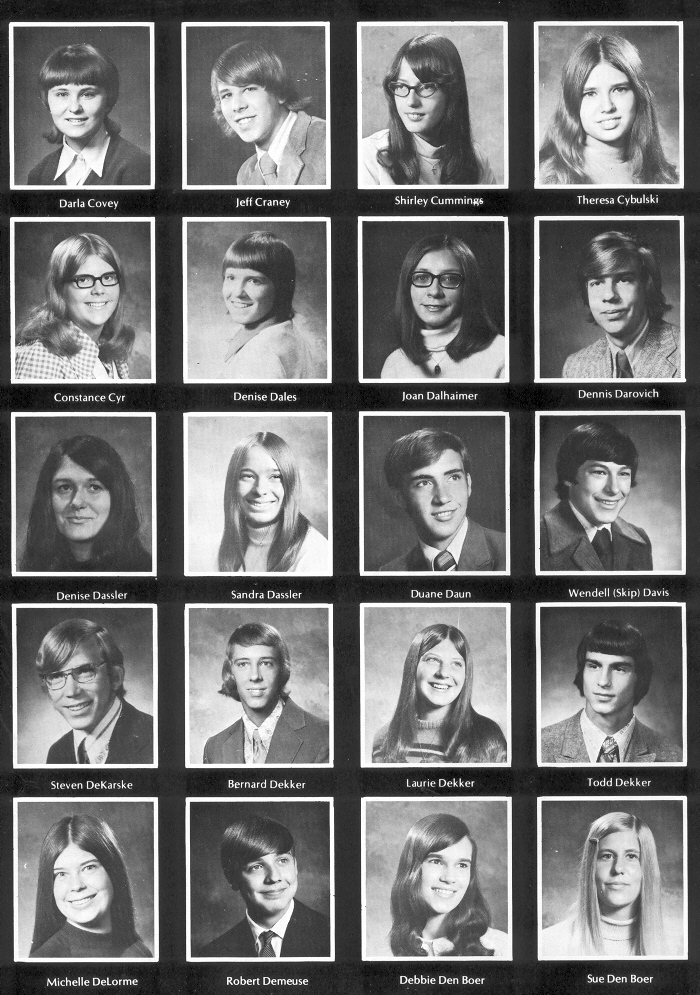 1973 Sheboygan North High School, Page 102: Darla Covey, Jeff Craney, Shirley Cummings, Theresa Cybulski, Constance Cyr, Denise Dales, Joan Dalhaimer, Dennis Darovich, Denise Dassler, Sandra Dassler, Duane Daun, Wendell Davis, Steven DeKarske, Bernard Dekker, Laurie Dekker, Todd Dekker, Michelle DeLorme, Robert Demeuse, Debbie Den Boer, Sue Den Boer.