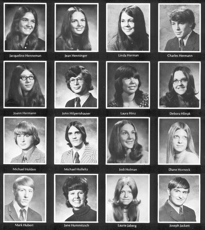 1973 Sheboygan North High School, Page 107: Jacqueline Henneman, Jean Henninger, Linda Herman, Charles Hermann, Joann Hermann, John Hilpertshauser, Laura Hinz, Debora Hlinak, Michael Holden, Michael Holfeltz, Jodi Holman, Diane Horneck, Mark Hubert, Jane Hummitzsch, Laurie Jaberg, Joseph Jackett.