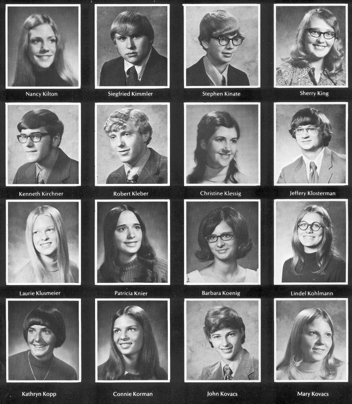 1973 Sheboygan North High School, Page 109: Nancy Kilton, Siegfried Kimmler, Stephen Kinate, Sherry King, Kenneth Kirchner, Robert Kleber, Christine Klessig, Jeffery Klosterman, Laurie Klusmeier, Patricia Knier, Barbara Koenig, Lindel Kohlmann, Kathryn Kopp, Connie Korman, John Kovacs, Mary Kovacs.