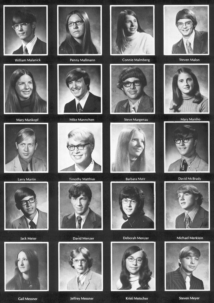 1973 Sheboygan North High School, Page 112: William Malanick, Penny Mallmann, Connie Malmberg, Steven Malon, Mary Mankopf, Mike Mannchen, Steve Margenau, Mary Marsho, Larry Martin, Timothy Matthias, Barbara Matz, David McBrady, Jack Meier, David Menzer, Deborah Menzer, Michael Merklein, Gair Messner, Jeffrey Messner, Kristi Matscher, Steven Meyer.