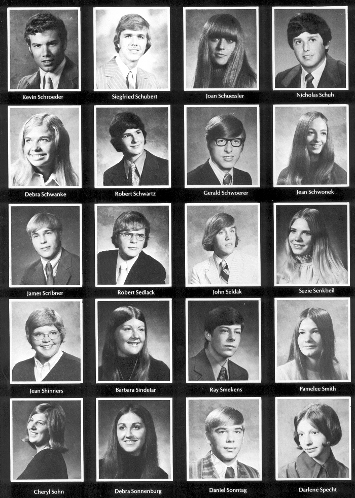 1973 Sheboygan North High School, Page 118: Kevin Schroeder, Siegfried Schubert, Joan Schuessler, Nicholas Schuh, Debra Schwanke, Robert Schwartz, Gerald Schwoerer, Jean Schwonek, James Schribner, Robert Sedlack, John Seldak, Suzie Senkbeil, Jean Shinners, Barbara Sindelar, Ray Smekens, Pamelee Smith, Cheryl Sohn, Debra Sonnenburg, Daniel Sonntag, Darlene Specht.