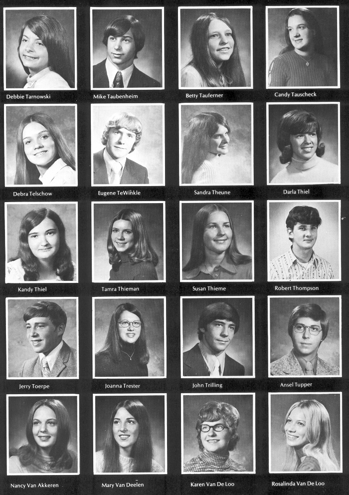 1973 Sheboygan North High School, Page 120: Debbie Ternowski, Mike Taubenheim, Betty Tauferner, Candy Tauscheck, Debra Telschow, Eugene TeWinkle, Sandra Theune, Darla Thiel, Kandy Thiel, Tamra Thielman, Susan Thieme, Robert Thompson, Jerry Toerpe, Joanna Trester, John Trilling, Ansel Tupper, Nancy Van Akkeren, Mary Van Deelen, Karen Van De Loo, Rosalinda Van De Loo.
