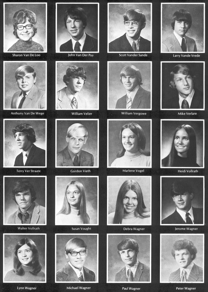 1973 Sheboygan North High School, Page 121: Sharon Van De Loo, John Van Der Puy, Scott Vander Sande, Larry Vande Vrede, Anthony Van De Wege, William Velier, William Vergowe, Mike Verlare, Terry Ver Straate, Gordon Vieth, Marlene Vogel, Heidi Vollrath, Walter Vollrath, Susan Vought, Debra Wagner, Jerome Wagner, Lynn Wagner, Michael Wagner, Paul Wagner, Peter Wagner.