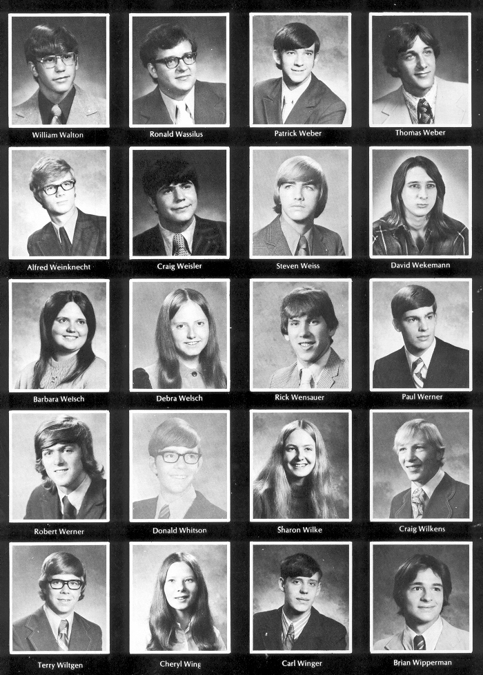 1973 Sheboygan North High School, Page 122: William Walton, Ronald Wassilus, Patrick Weber, Thomas Weber, Alfred Weinknecht, Graig Weisler, Steven Weiss, David Wekemann, Barbara Welsch, Debra Welsch, Rick Wensauer, Paul Werner, Robert Werner, Donald Whitson, Sharon Wilke, Craig Wilkens, Terry Wiltgen, Cheryl Wing, Carl Winger, Brian Wipperman.