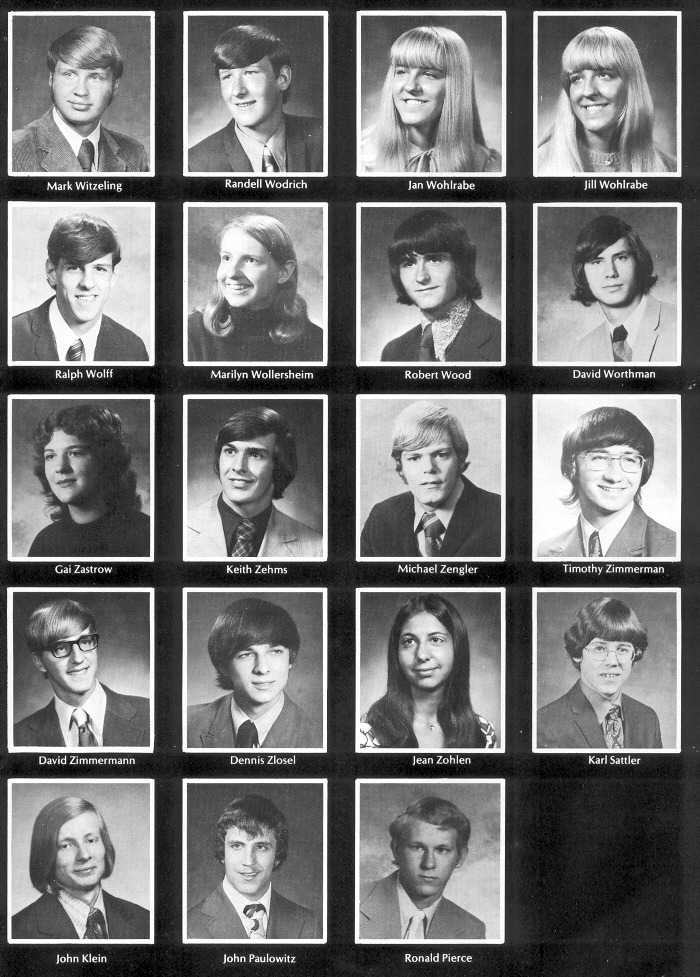 1973 Sheboygan North High School, Page 123: Mark Witzeling, Randell Wodrich, Jan Wohlrabe, Jill Wohlrabe, Ralph Wolff, Marilyn Wollersheim, Robert Wood, David Worthman, Gai Zastrow, Keith Zehms, Michael Zengler, Timothy Zimmerman, David Zimmermann, Dennis Zlosel, Jean Zohlen, Karl Sattler, John Klein, John Paulowitz, Ronald Pierce.