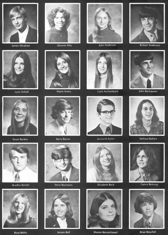 1973 Sheboygan North High School, Page 99: James Abraham, Dionne Alby, Julie Anderson, Robert Anderson, Lynn Anhalt, Marie Arens, Lynn Aschenbach, John Bachausen, Susan Backes, Barry Bacon, Kenneth Bailey, William Ballard, Bradley Bassler, Steve Baumann, Elizabeth Beck, Nancy Behring, Rose Belitz, Kristin Bell, Sharon Benzschawel, Brian Beuchel.