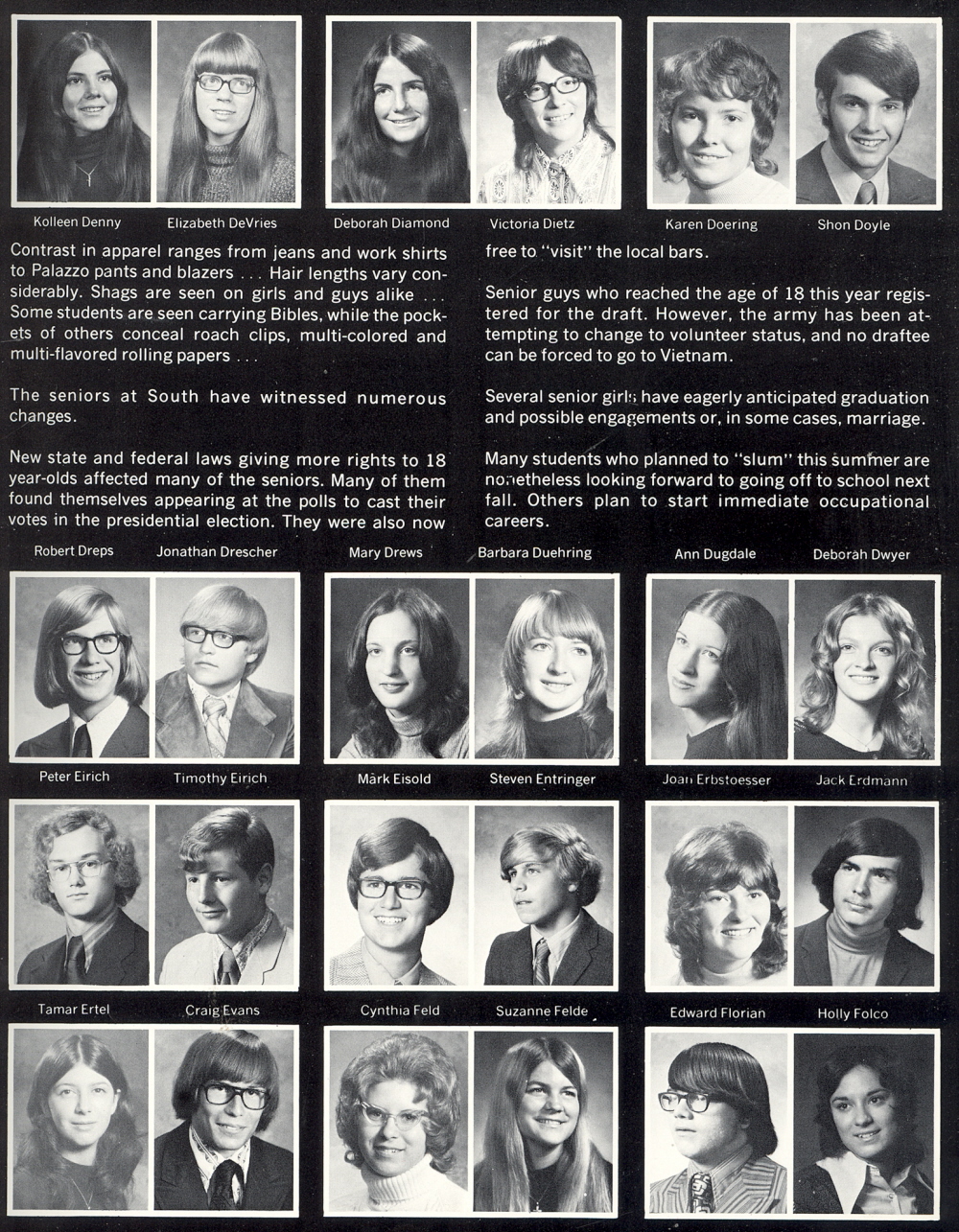 High School, Page 37: Kolleen Denny, Elizabeth DeVries, Deborah Diamond, Victoria Dietz, Karen Doering, Shon Doyle, Robert Dreps, Jonathan Drescher, Mary Drews, Barbara Duehring, Ann Dugdale, Deborah Dwyer, Peter Eirich, Timothy Eirich, Mark Eisold, Steven Entringer, Joan Erbstoesser, Jack Erdmann, Tamar Ertel, Craig Evans, Cynthia Feld, Suzanne Felde, Edward Florian, Holly Folco.