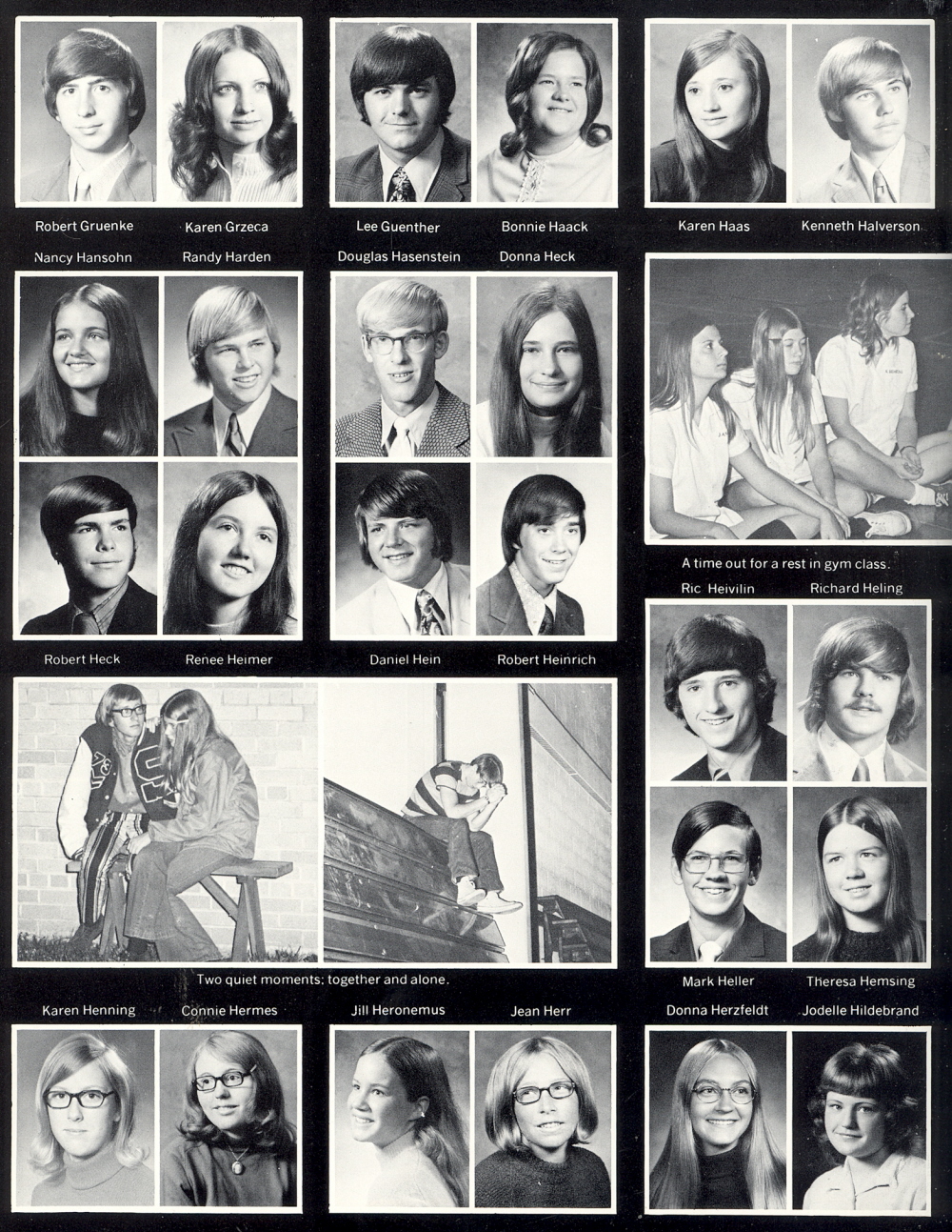 High School, Page 40: Robert Gruenke, Karen Grzeca, Lee Guenther, Bonnie Haack, Karen Haas, Kenneth Halverson, Nancy Hansohn, Randy Harden, Douglas Hasenstein, Donna Heck, Robert Heck, Renee Heimer, Daniel Hein, Robert Heinrich, Ric Heivilin, Richard Heling, Mark Heller, Theresa Hemsing, Karen Henning, Connie Hermes, Jill Heronemus, Jean Herr, Donna Herzfeldt, Jodelle Hildebrand.