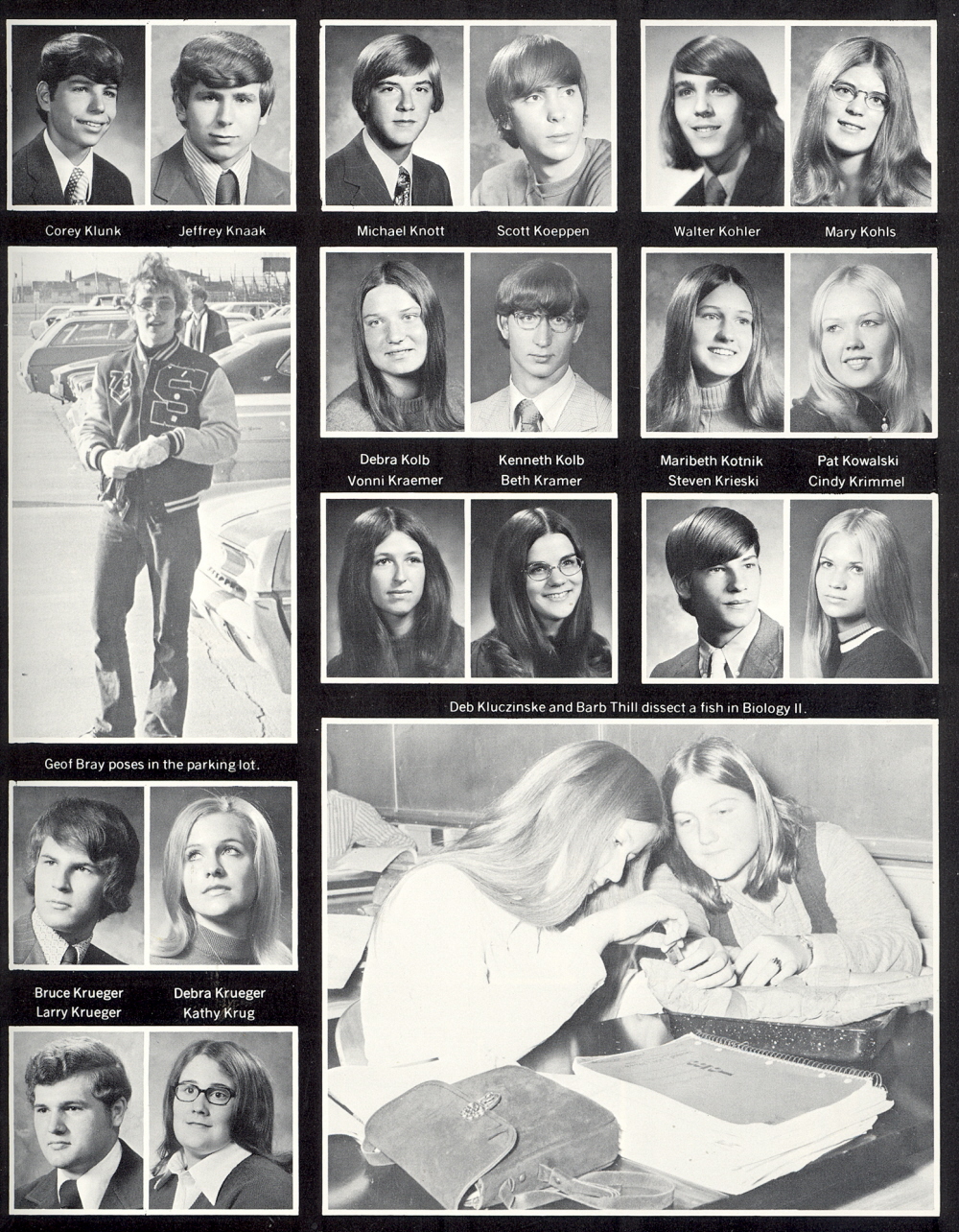 High School, Page 43: Corey Klunk, Jeffrey Knaak, Michael Knott, Scott Koeppen, Walter Kohler, Mary Kohls, Debra Kolb, Kenneth Kolb, Maribeth Kotnik, Pat Kowalski, Vonni Kraemer, Beth Kramer, Steven Krieski, Cindy Krimmel, Bruce Krueger, Debra Krueger, Larry Krueger, Kathy Krug.