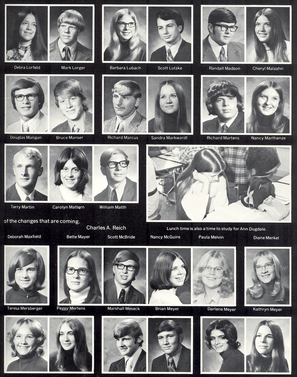 High School, Page 45: Debra Lorfeld, Mark Lorger, Barbara Lubach, Scott Lutzke, Randall Madson, Cheryl Malzahn, Douglas Mangan, Bruce Manser, Richard Marcus, Sandra Markwardt, Richard Martens, Nancy Marthenze, Terry Martin, Carolyn Mattern, William Matth, Deborah Maxfield, Bette Mayer, Scott McBride, Nancy McGuire, Paula Melvin, Diane Merkel, Teresa Mersberger, Peggy Mertens, Marshall Meseck, Brian Meyer, Darlene Meyer, Kathryn Meyer.